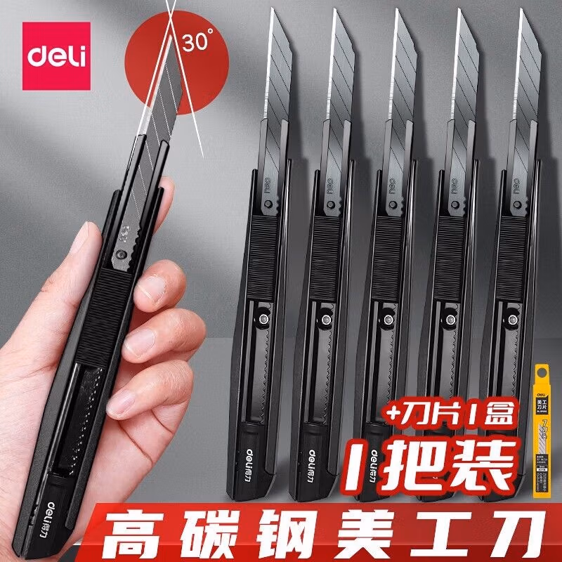 得力(deli)黑刃金属美工刀 小号裁纸刀切纸刀 锋利金属刀架 锌合金刀壳 30°黑刃美工刀+黑刃刀片10片