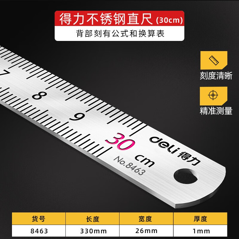 得力学生直尺 文具钢尺 厘米刻度尺钢制直尺不锈钢铁尺子 金属尺子 8463钢直尺30厘米 银色(1支) 自营