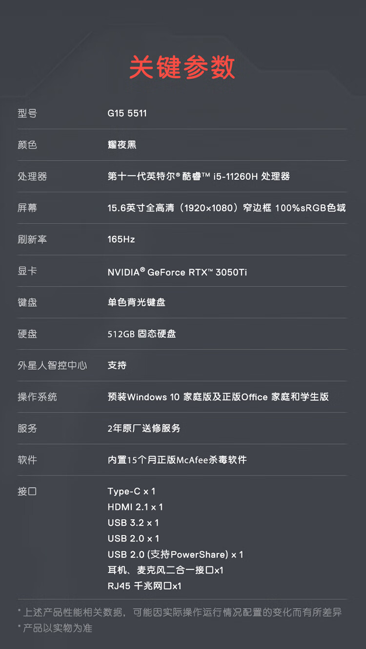 戴尔(DELL)游匣G15 15.6英寸游戏笔记本电脑(11代英特尔酷睿i5-11260H 16G 512G RTX3050Ti 165Hz高色域)黑 自营
