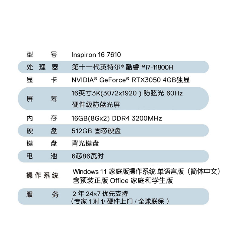 戴尔笔记本电脑Dell灵越16Plus 英特尔酷睿16英寸轻薄全能本设计师 i7-11800H 16G 512G RTX3050 3K屏 灰蓝 自营