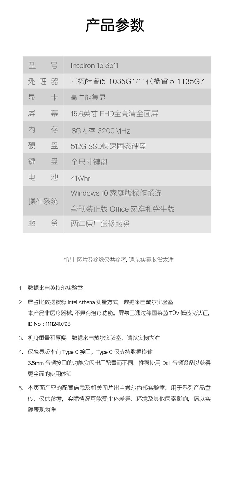 戴尔(DELL)笔记本灵越3511 15.6英寸超极本手提轻薄学生网课办公游戏笔记本电脑 四核酷睿i5 16G内存 512G固态 高配定制 高性能集显 自营