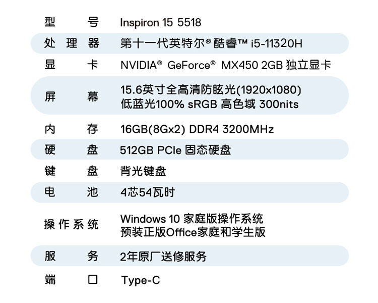 戴尔DELL灵越15Pro-5518 15.6英寸高色域防蓝光商务笔记本电脑标压i5-11320H 16G 512G MX450 100%sRGB银 自营