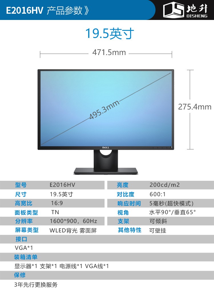 戴尔(DELL)E2016HV 19.5英寸显示屏幕液晶电脑显示器企业办公 自营