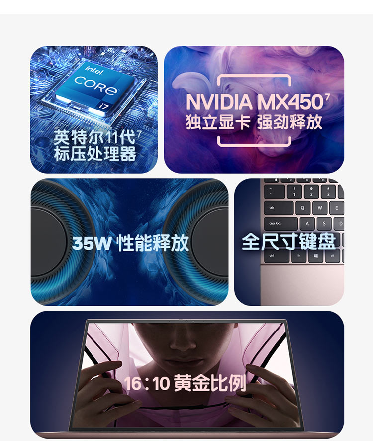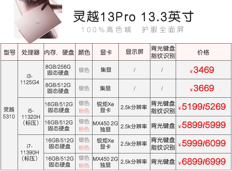 戴尔笔记本电脑dell灵越13Pro5310超轻薄商务办公游戏游戏女生超极本标压i7-11390H 16G 512G 指纹识别 标配 粉色 13.3英寸防蓝光2.5K高色域屏 自营