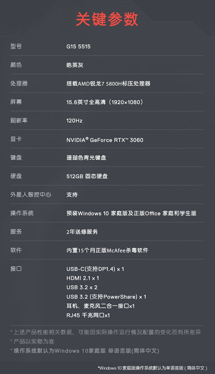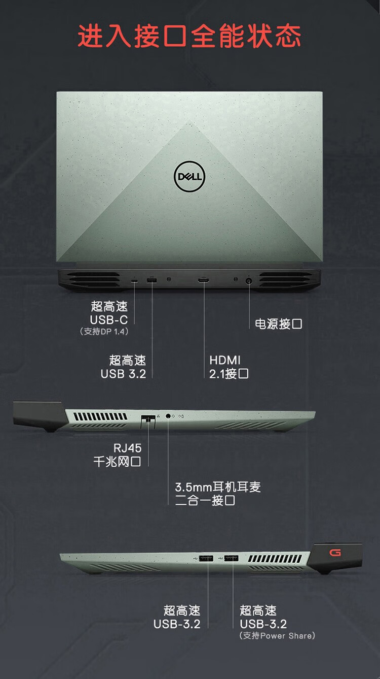 戴尔(DELL)【RTX3060新品】游匣G15 5515锐龙版 15.6英寸电竞游戏本笔记本电脑 120HZ:R7-5800H 6G独显 16G内存512G固态 标配 自营