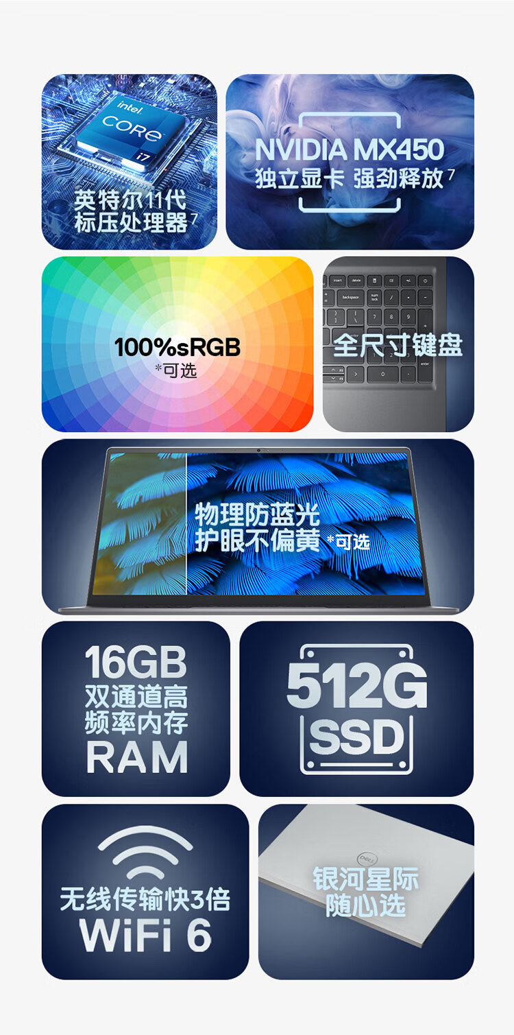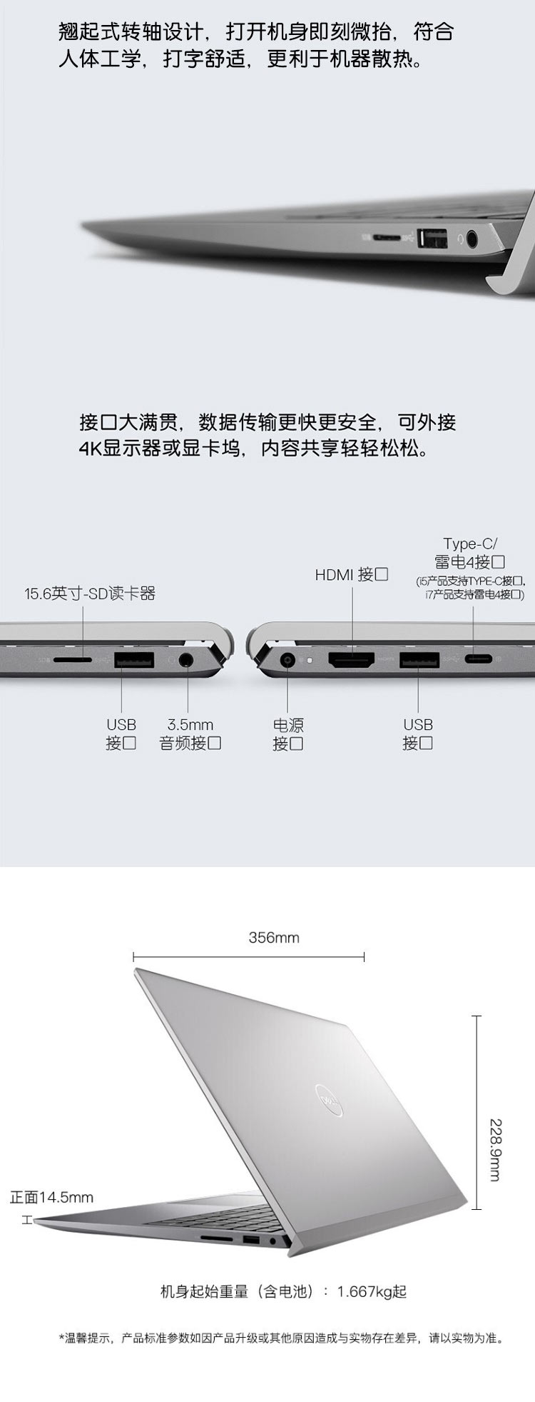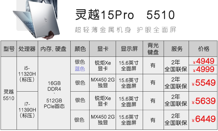 戴尔笔记本dell灵越15Pro5510超薄本家用学生办公游戏手提电脑15.6英寸 标压i7-11390H 锐炬Xe显卡 银色 16G内存 1TB PCIe固态 定制 自营