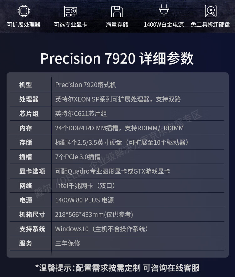 戴尔(DELL)T7920图形工作站电脑主机至强银牌4210R/32G内存/256G固态+1T机械硬盘/P620-2G显存/三年保修 自营