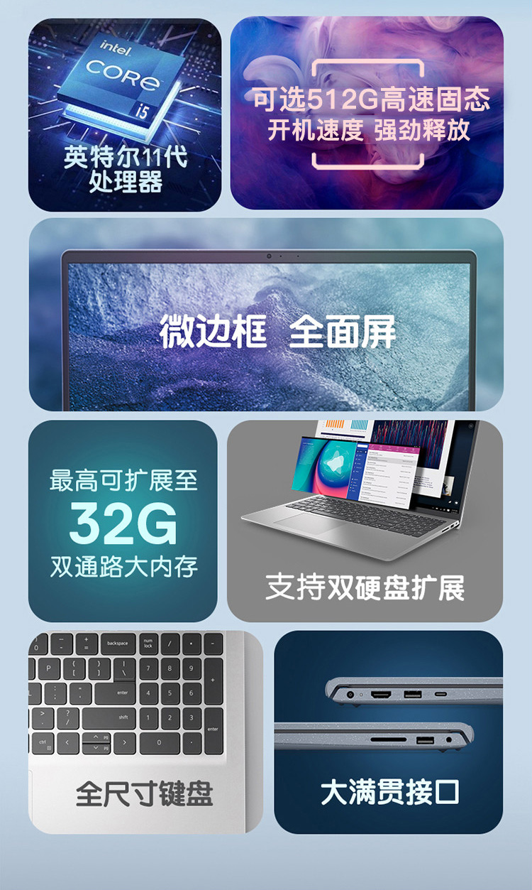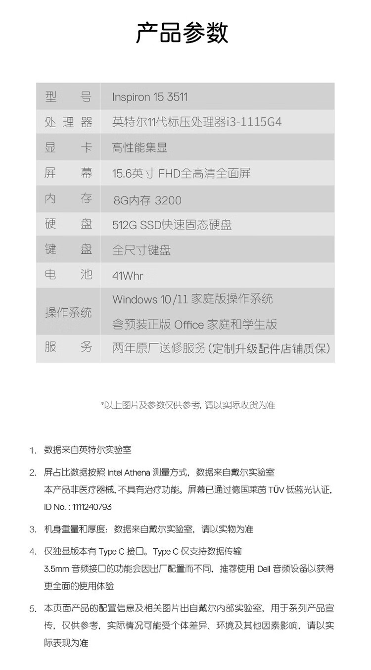戴尔(DELL)灵越3511轻薄本15.6英寸网课办公学生手提商用笔记本电脑 高性能核显 全高清屏 i3-1115G4 8GB 256G固态 定制 自营