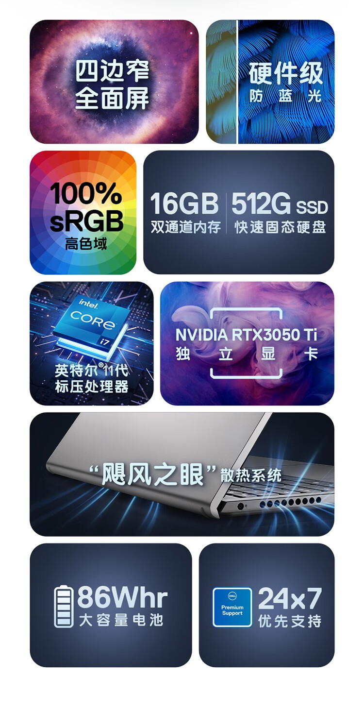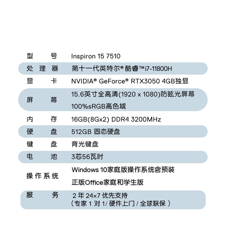 戴尔(DELL)灵越7510 15Plus 15.6英寸11代酷睿男女大学生设计师轻薄办公笔记本电脑 标配 16G512G固态 7510-i7-11800H RTX3050 自营