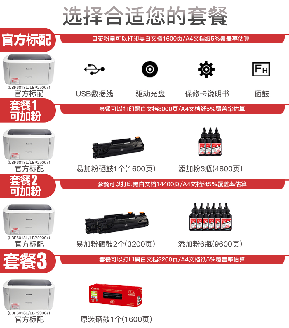 佳能LBP6018L LBP2900+打印机家用商务办公黑白A4幅面激光打印机 LBP2900+(品质型) 官方标配(主机+原装硒鼓+电源线+数据线) 自营