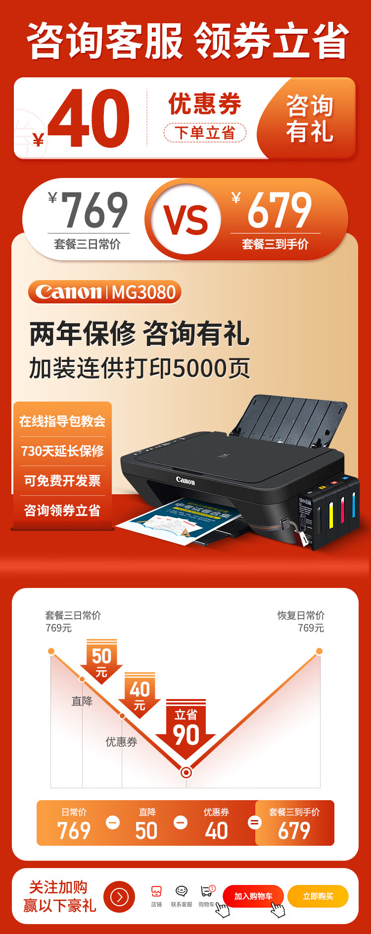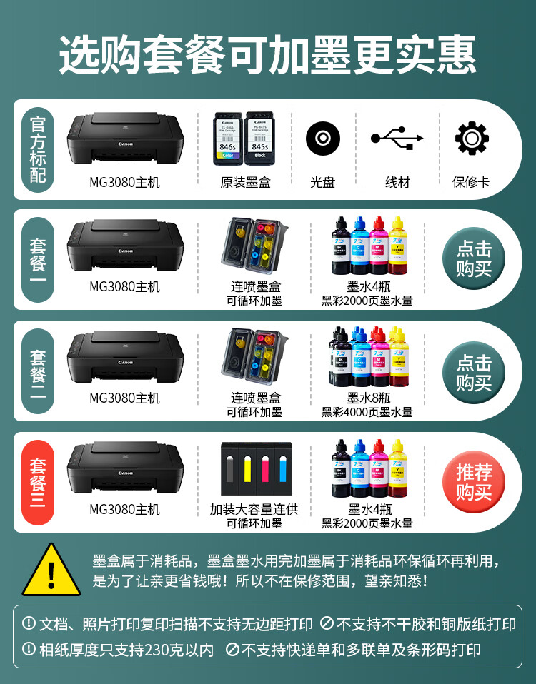 佳能(Canon)MG3080打印机家用无线彩色喷墨照片打印复印扫描一体机家庭黑白小型学生办公A4 套餐二:MG3080+连喷可加墨+墨水8瓶 自营