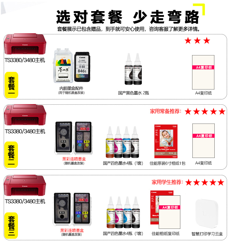 佳能(Canon)TS3380/3480家用喷墨连供打印机手机无线学生作业彩色照片打印复印扫描一体机 黑白套四(黑彩连喷加墨+墨水+相纸+标配) 自营
