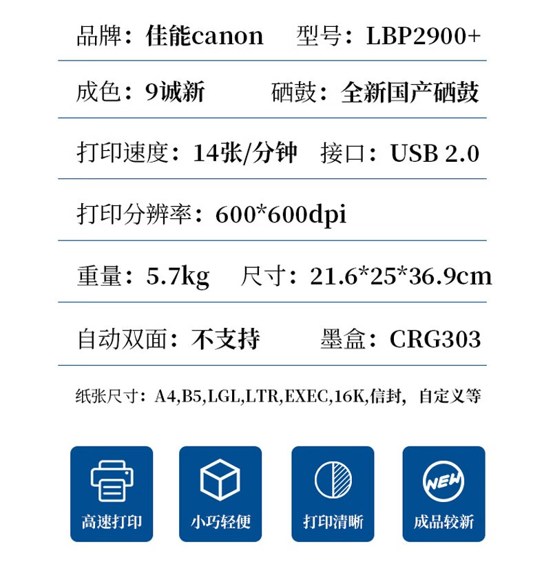 【二手9成新】佳能(Canon)LBP2900 lbp2900+ A4黑白单功能激光打印机 家用办公 佳能LBP2900 自营