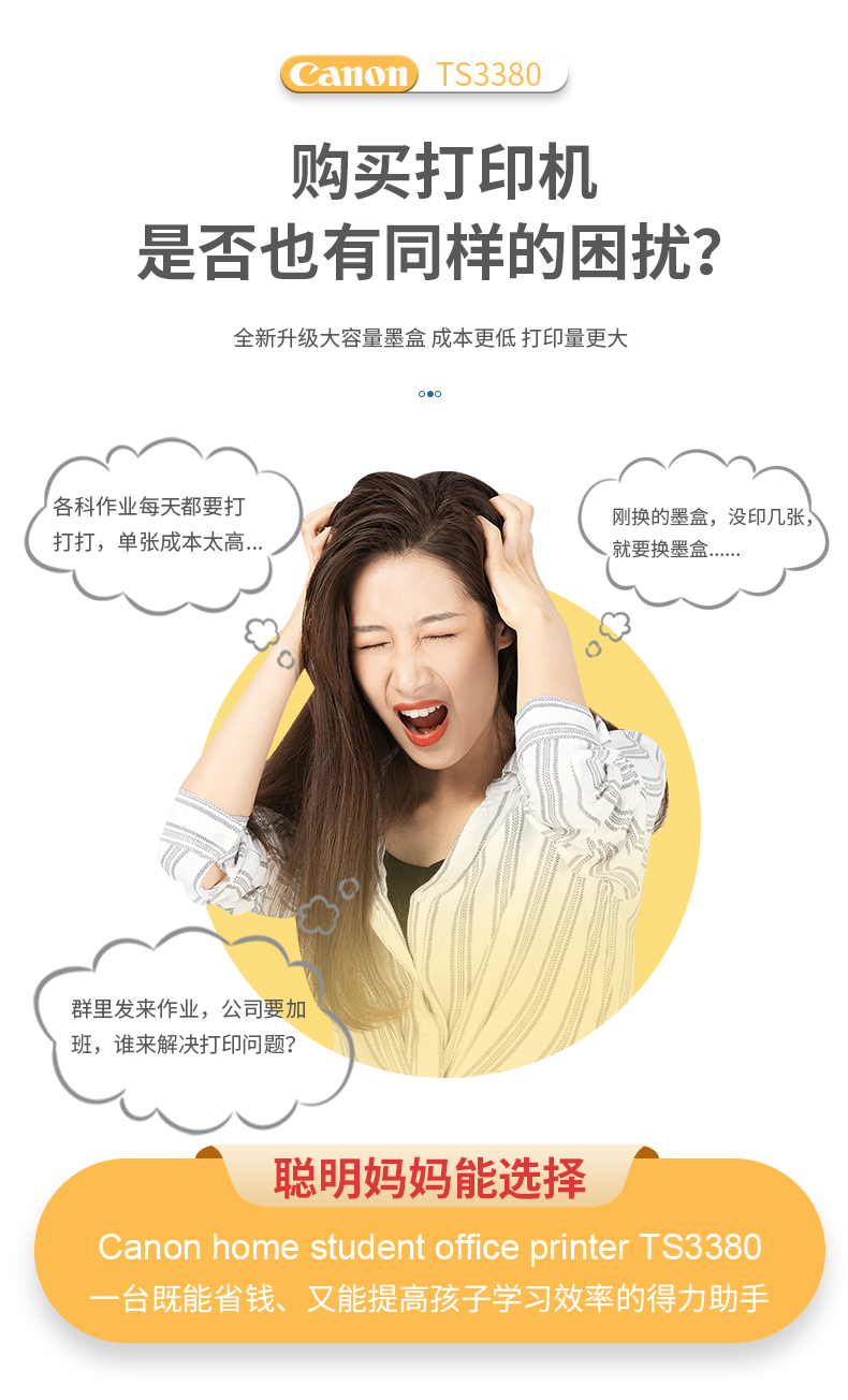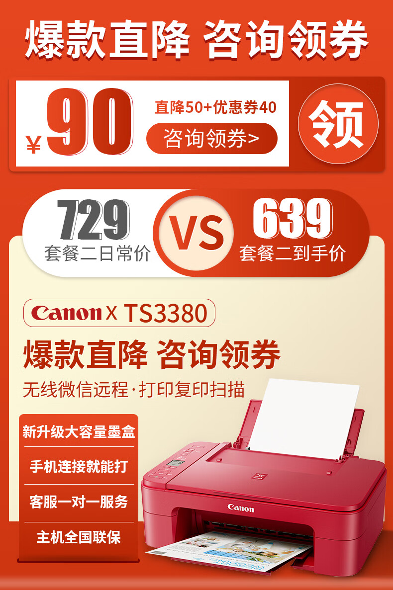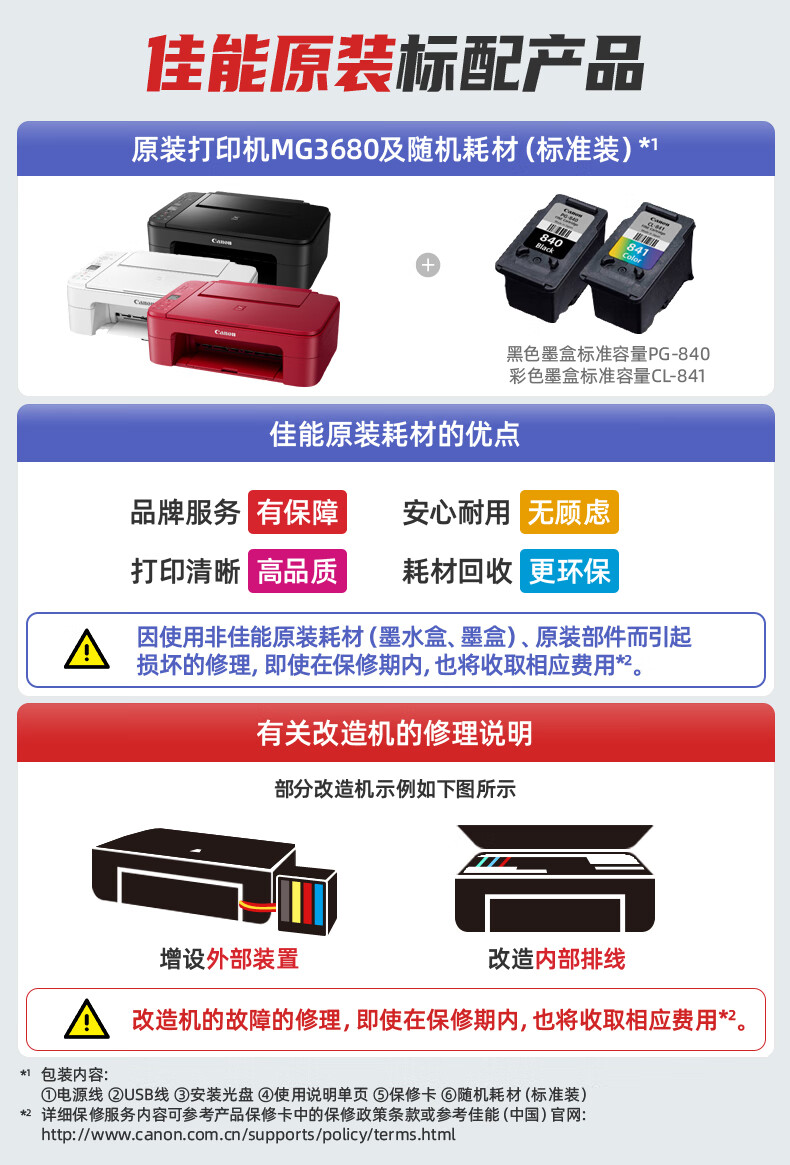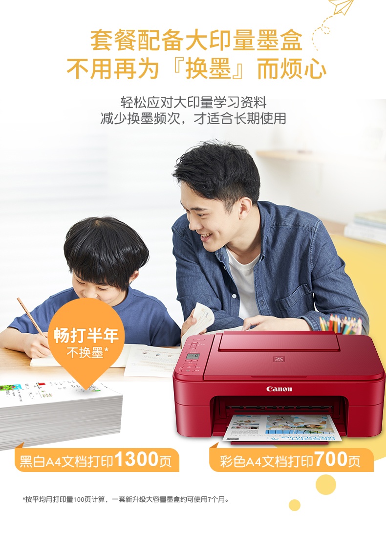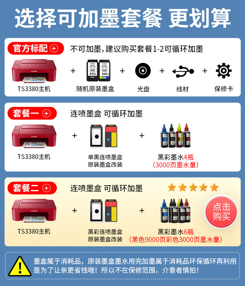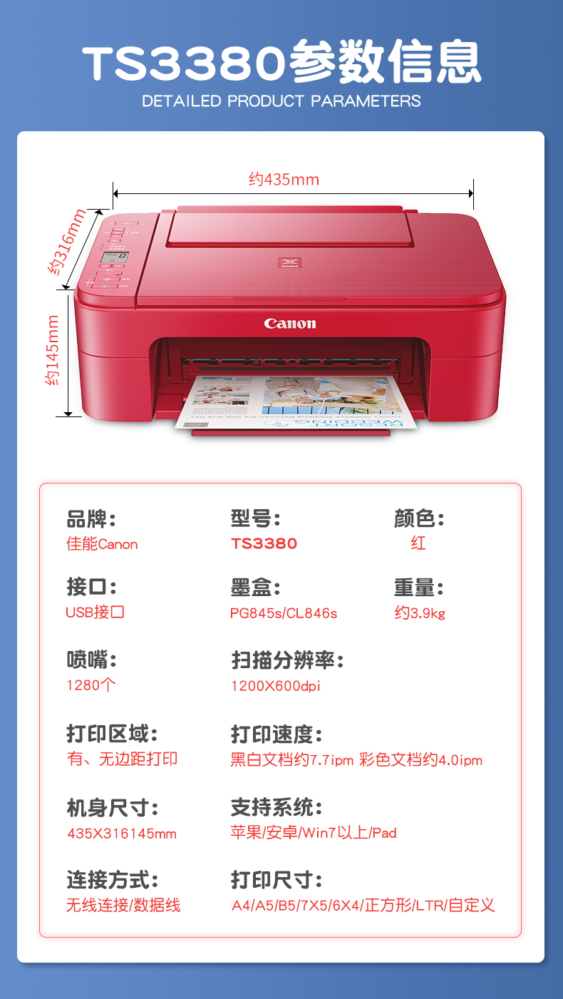 佳能TS3380彩色喷墨打印机家用小型办公照片无线打印复印扫描一体机ts3180升级 红色款 白色【无线打印复印扫描 微信远程 照片无边距】 套餐一:主机+扩容大印量连喷墨盒+4瓶黑彩墨水 自营