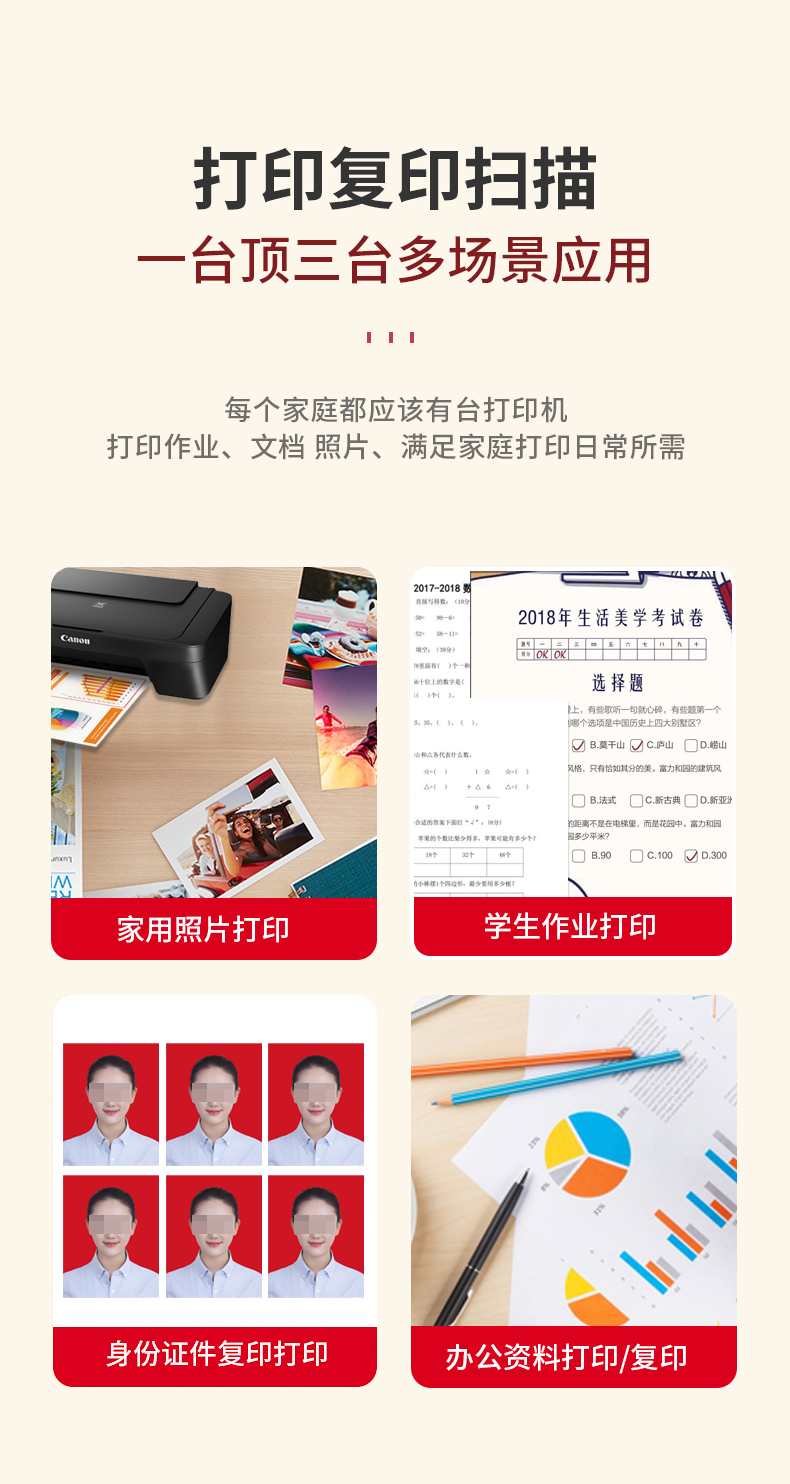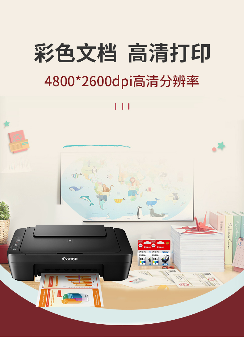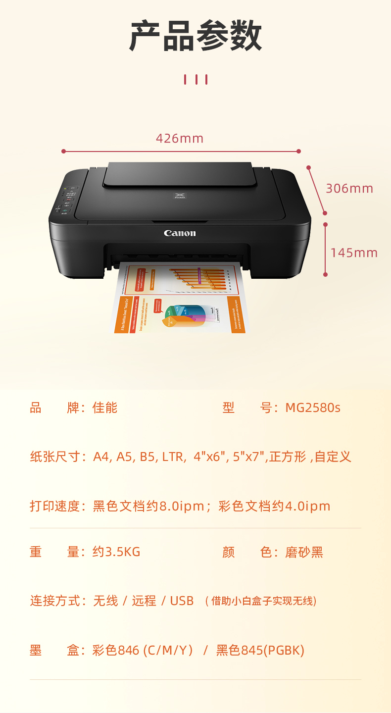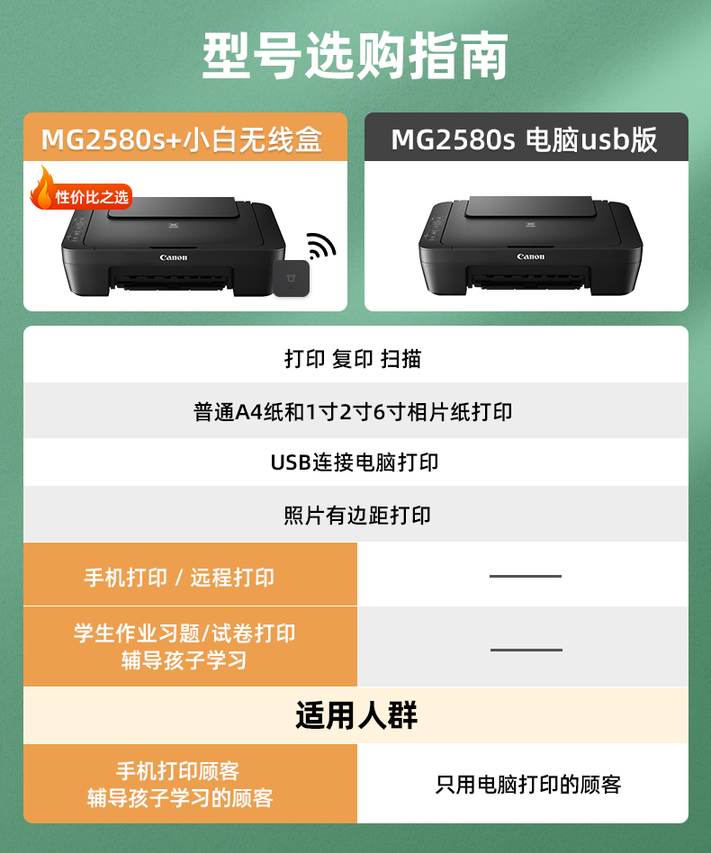 佳能MG2580S彩色喷墨照片打印机家用学习作业小型办公复印扫描一体机加小白盒子手机无线QQ微信远程 MG2580S(仅USB连接电脑打印) 官方标配(随机墨盒·印量小·不可加墨) 自营