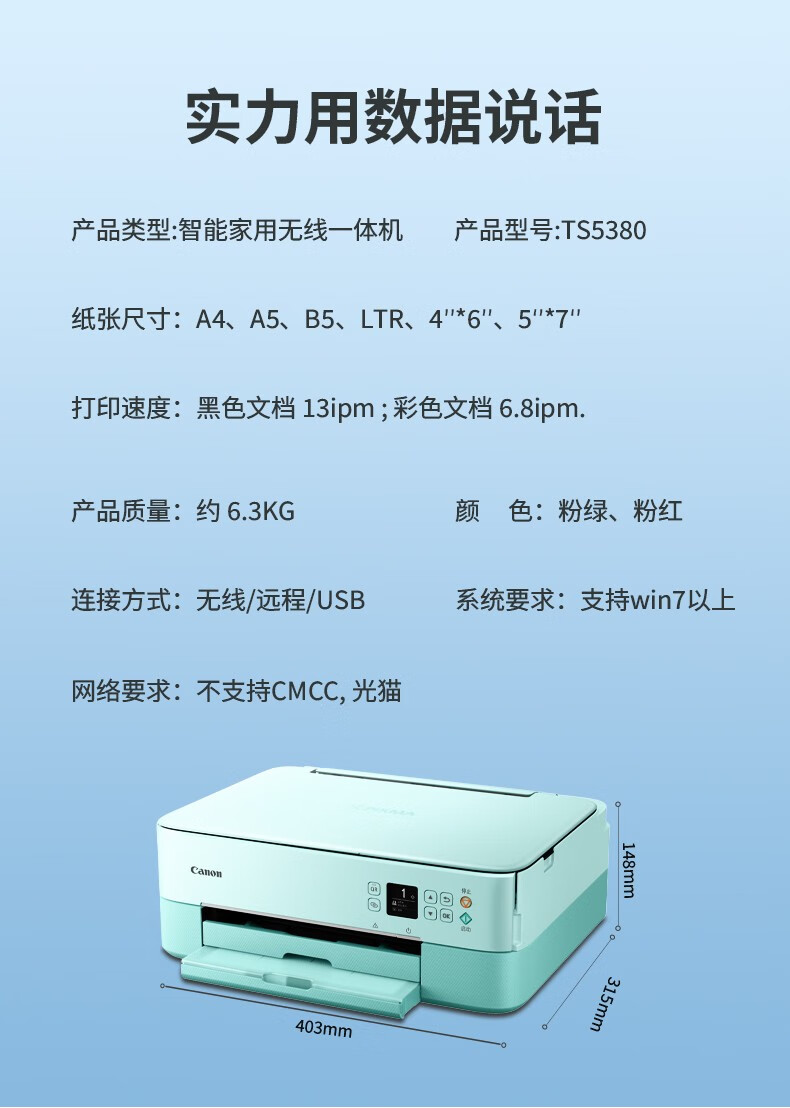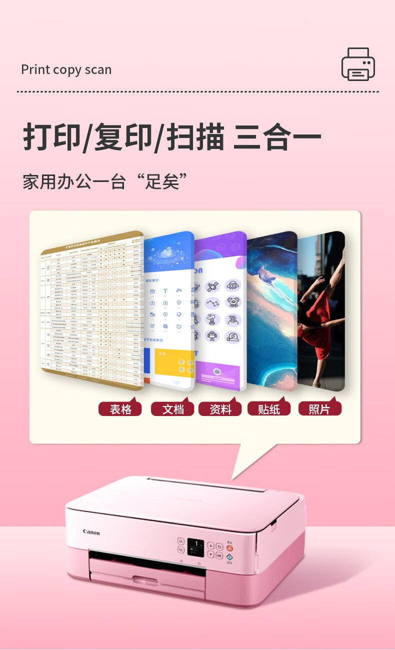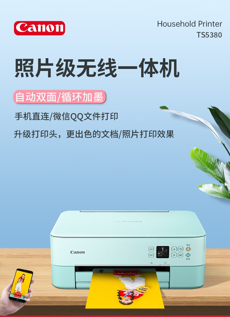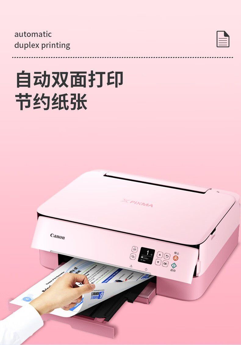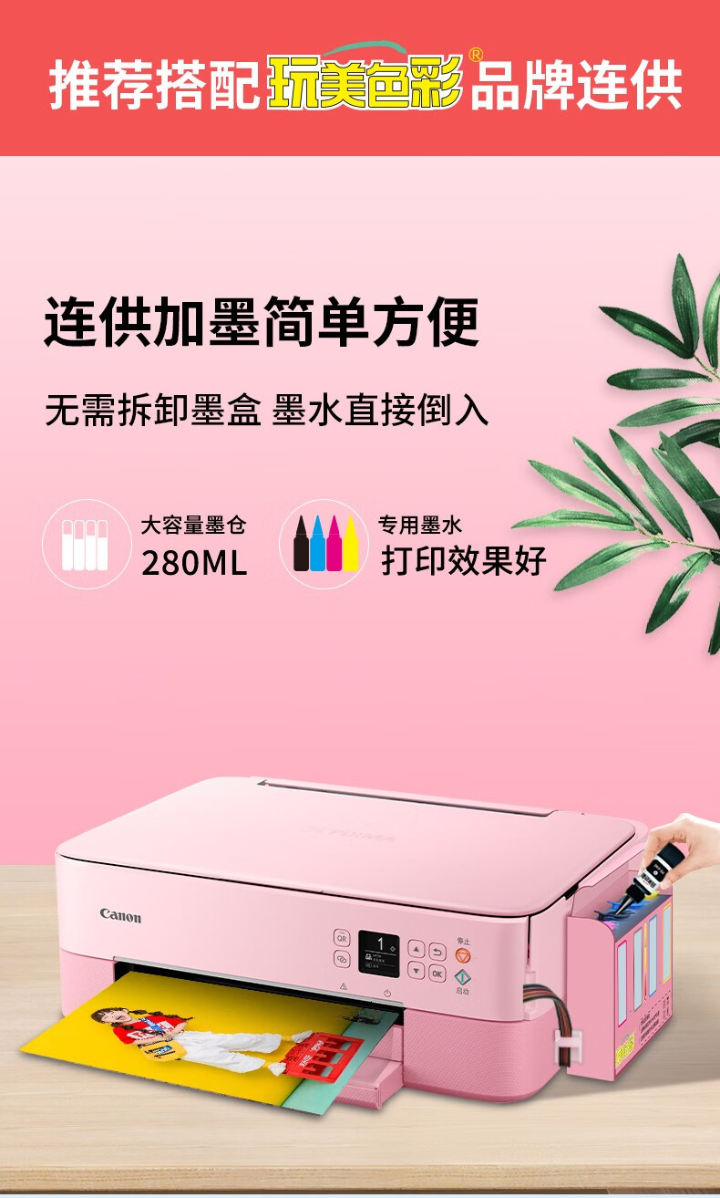 佳能TS5380打印机家用小型连供无线喷墨打印复印扫描多功能一体机彩色双面办公手机照片相片 TS5380马卡龙粉色 套餐2(家用套餐):升级连供+1套墨水 自营