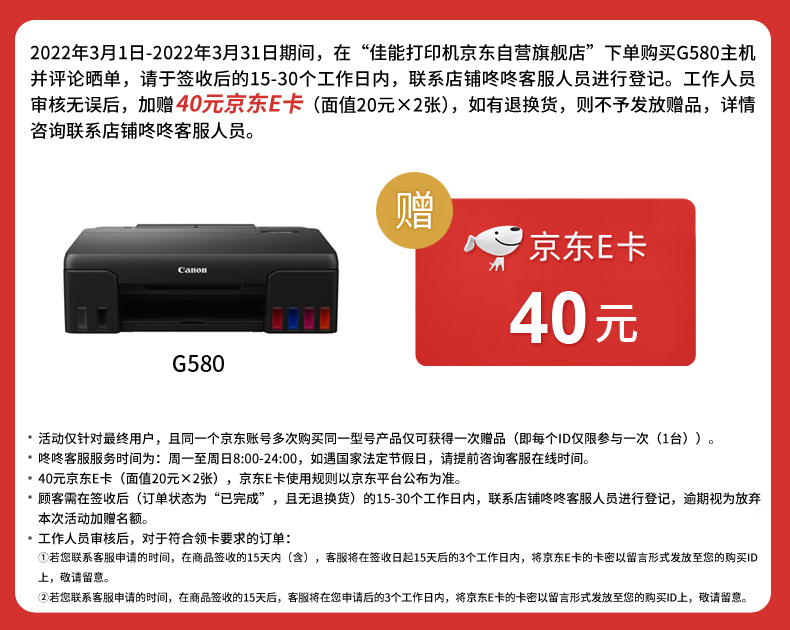 佳能(Canon)G580 6色加墨式照片打印机(单打印 WIFI/云打印 低成本大印量照片打印) 自营