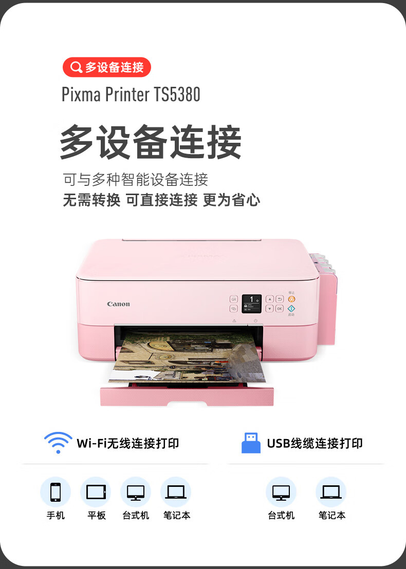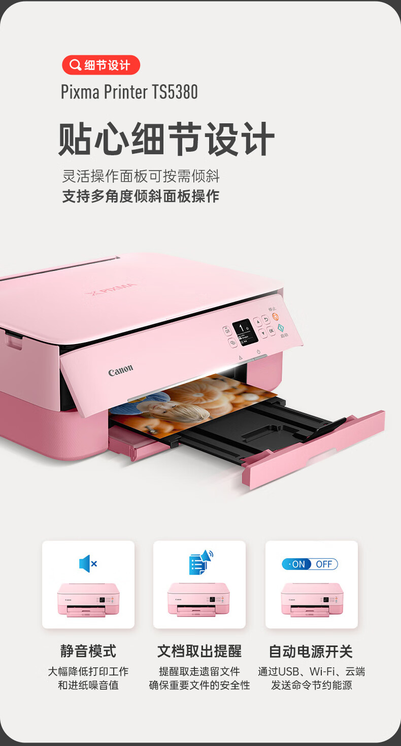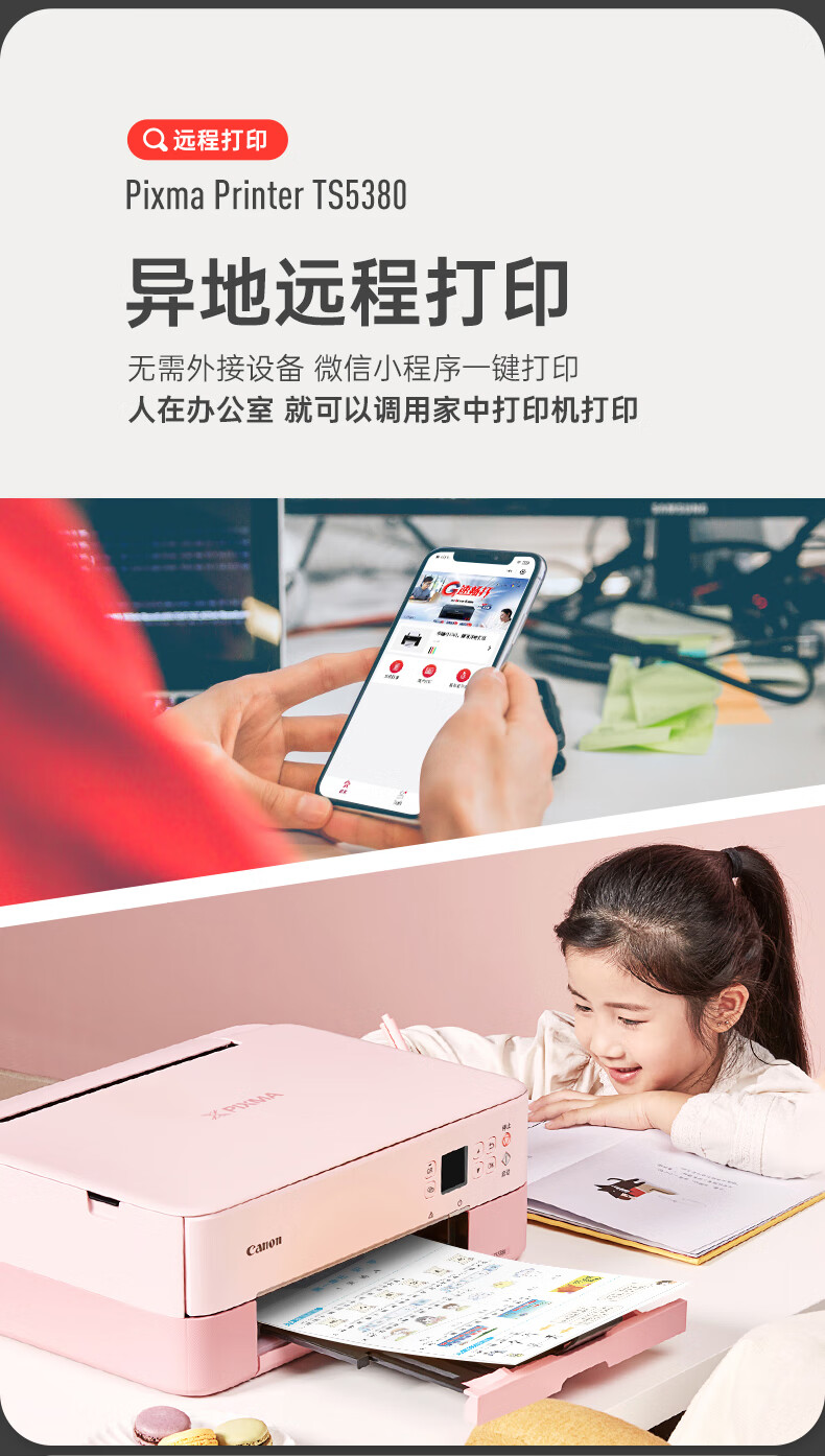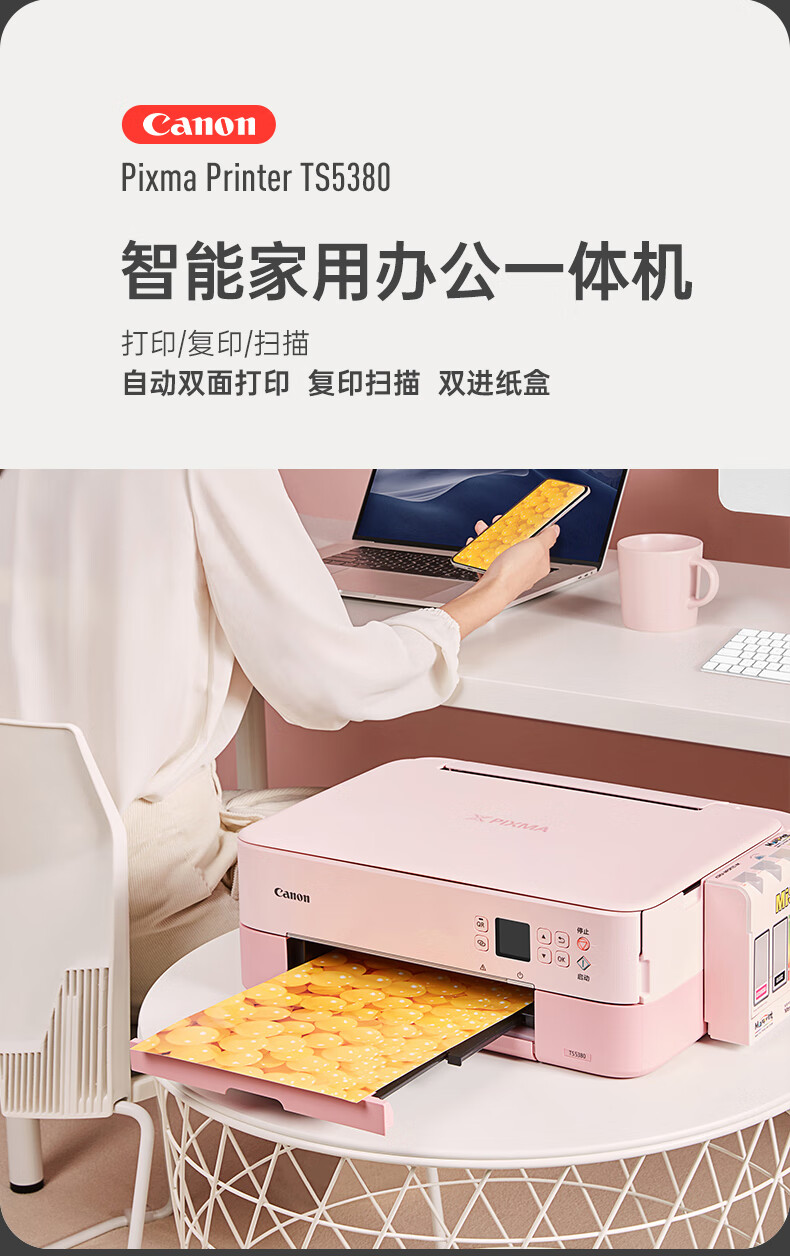 佳能TS5380彩色照片打印机喷墨一体机家用手机办公打印复印扫描无线Wifi连接 TS5380粉红色 套餐三【MISS专业大容量连供+8瓶墨水】 自营