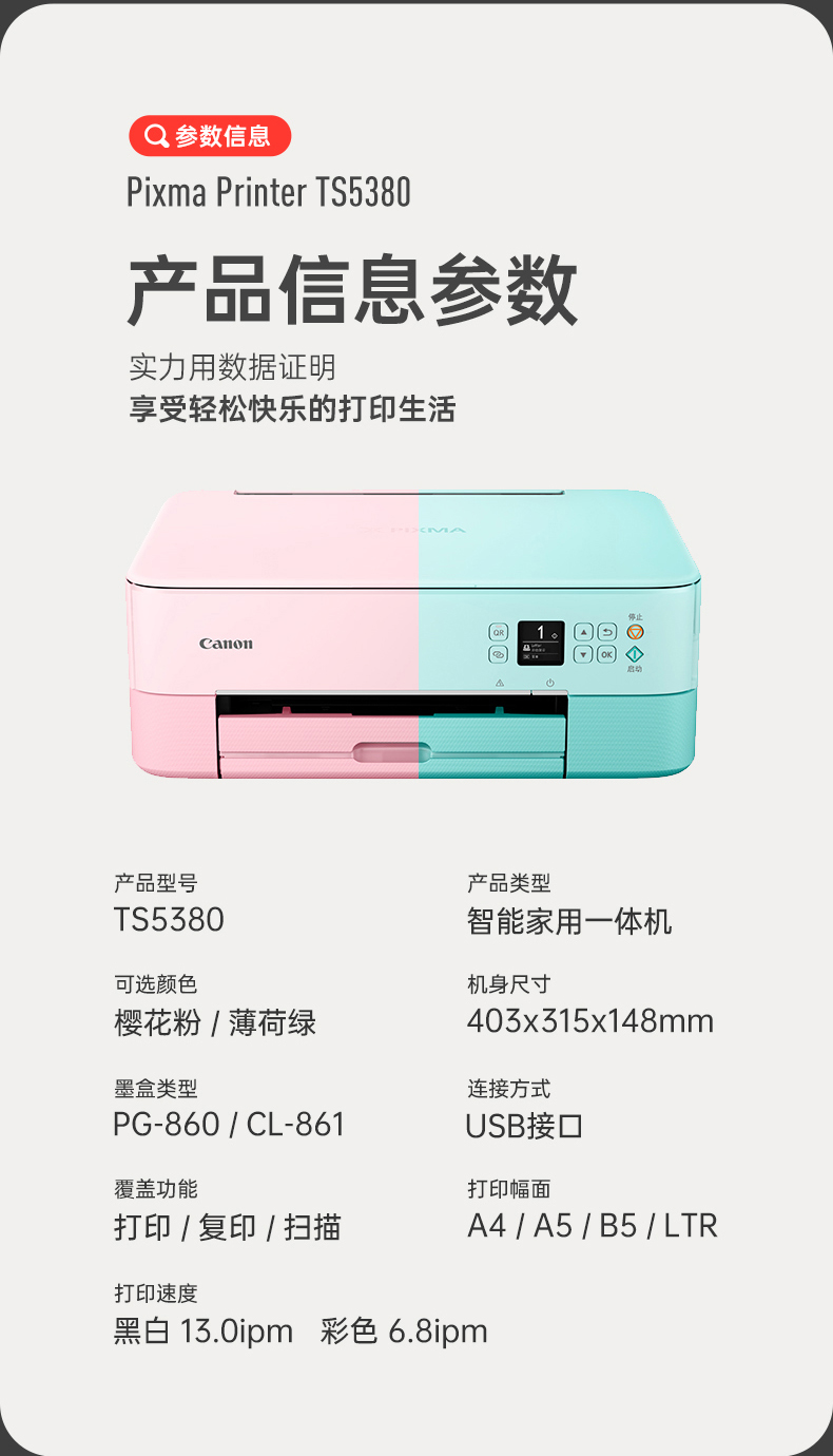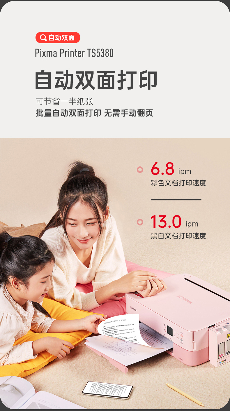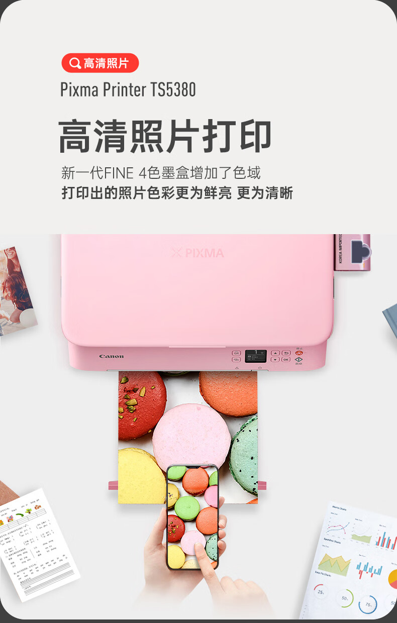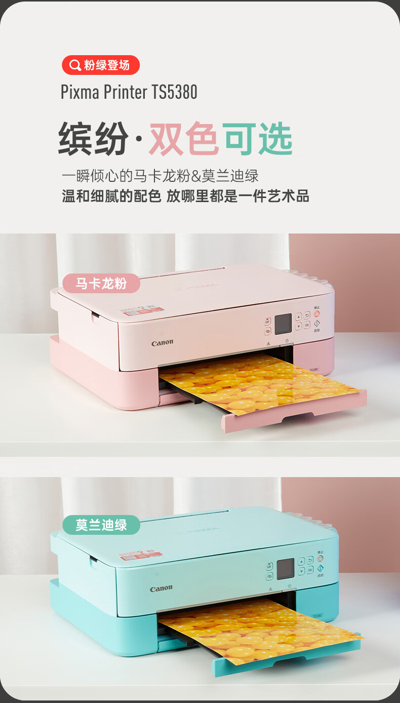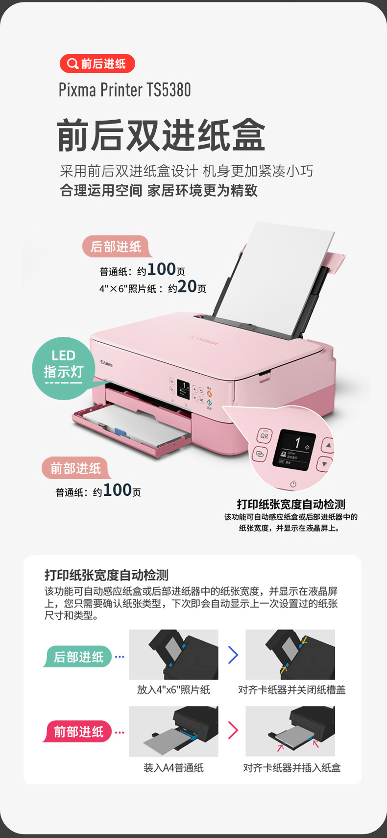 佳能TS5380彩色照片打印机喷墨一体机家用手机办公打印复印扫描无线Wifi连接 TS5380粉红色 套餐三【MISS专业大容量连供+8瓶墨水】 自营