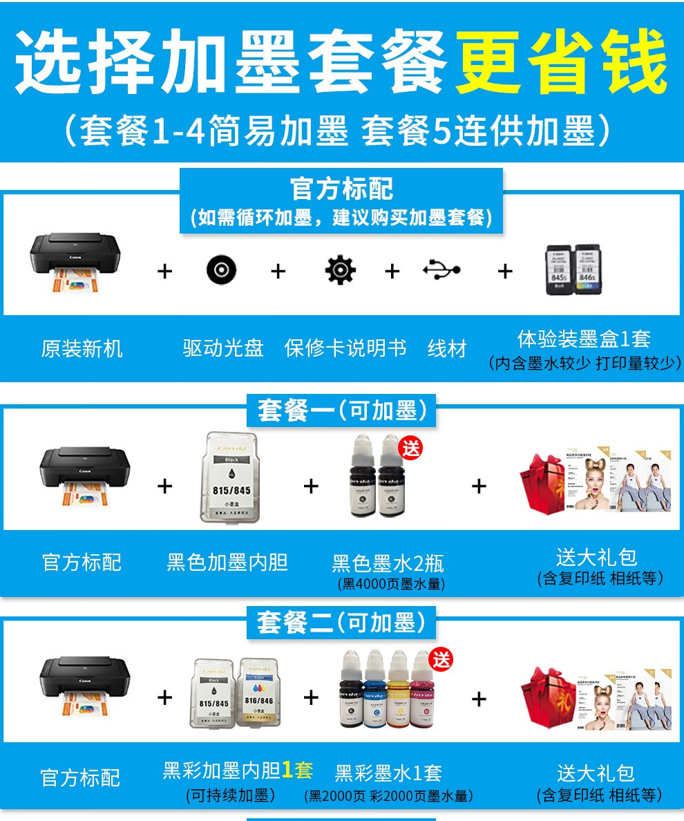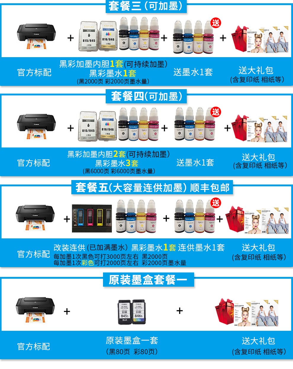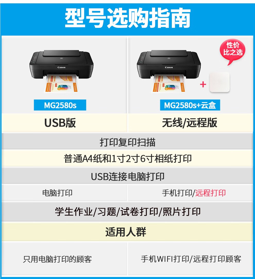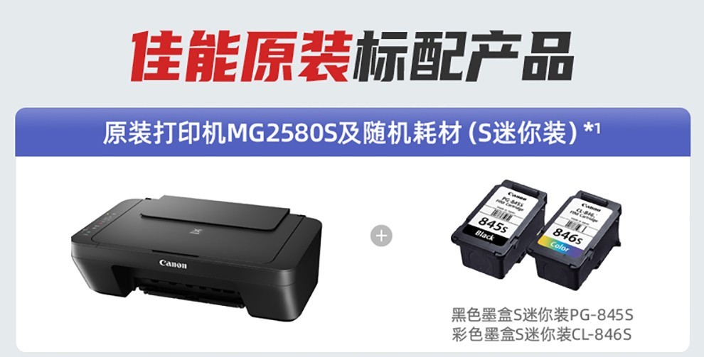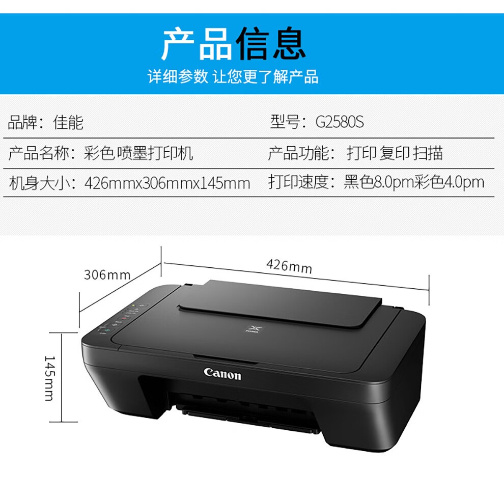 佳能(Canon)MG2580S彩色家用打印机一体机复印小型连供喷墨办公无线远程家庭照片学生作业 无线款MG2580S【套餐可加墨】 套餐一:官方标配+黑色加墨内胆1个+黑色墨水2瓶 自营