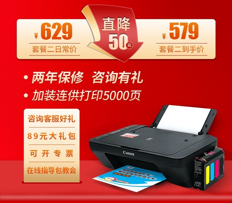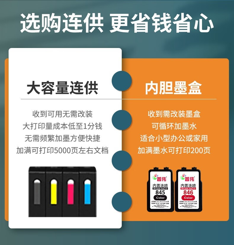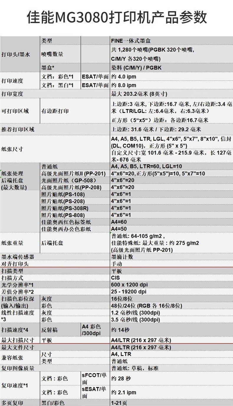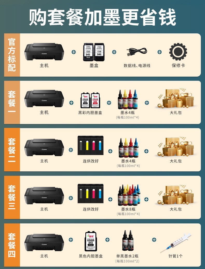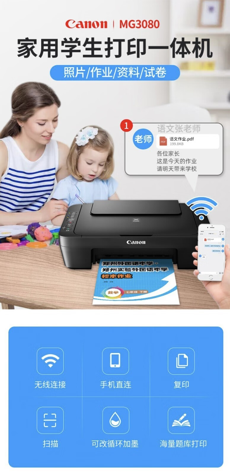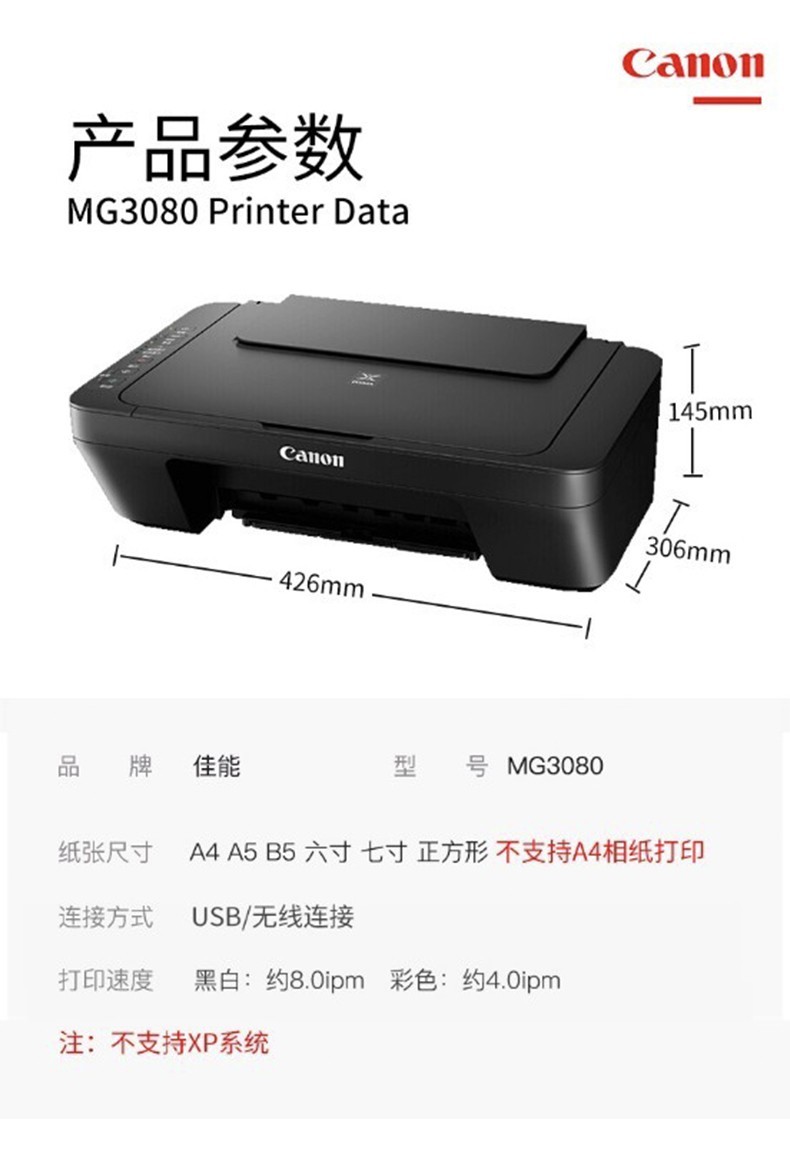 佳能MG3080打印机家用无线wifi彩色喷墨照片打印复印扫描一体机家庭黑白可加墨学生小型办公打印机 MG3080套餐1:标配+内胆墨盒+4瓶墨水 自营