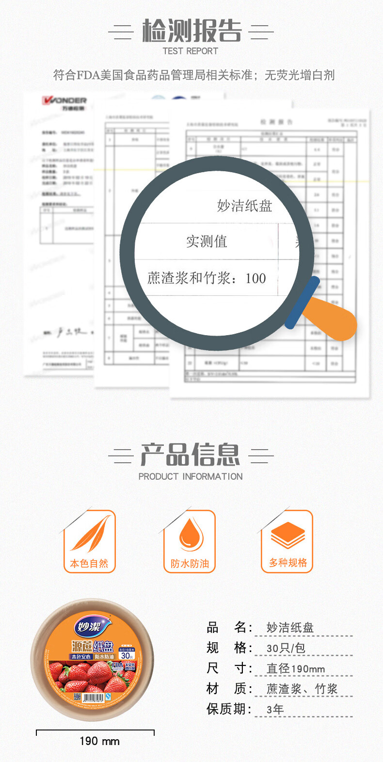 妙洁一次性纸碗圆盘19cm30只装 自营