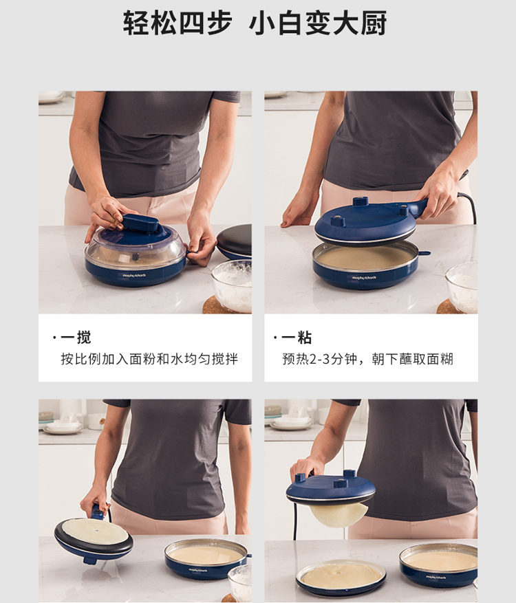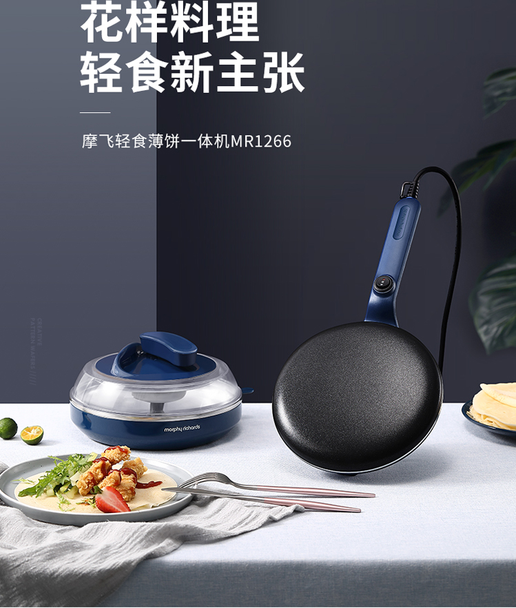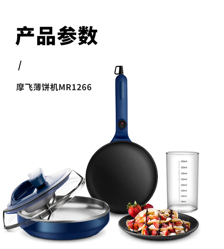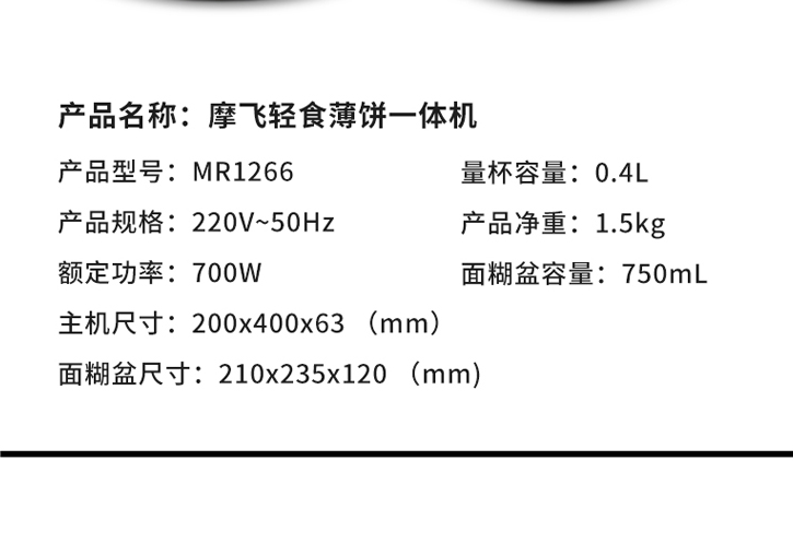 商品名称:摩飞电器MR1266 商品毛重:2.34kg 商品产地:中国大陆 操控方式:机械式 类别:薄饼机 烤盘直径:25cm以下 特色功能:速热,自动恒温,春饼/薄饼 功率:1000W及以下 清洗方式:不可拆洗 烤盘深度:20mm以下 烤盘形状:圆盘 火力调节:不可调节