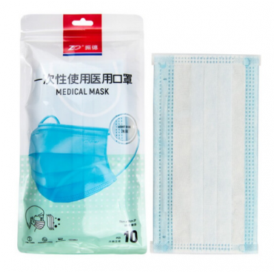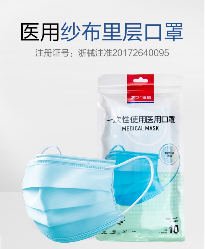 振德医疗一次性使用医用口罩纱布内层独立包装 浅蓝色(10只独立装)(纱布内层)