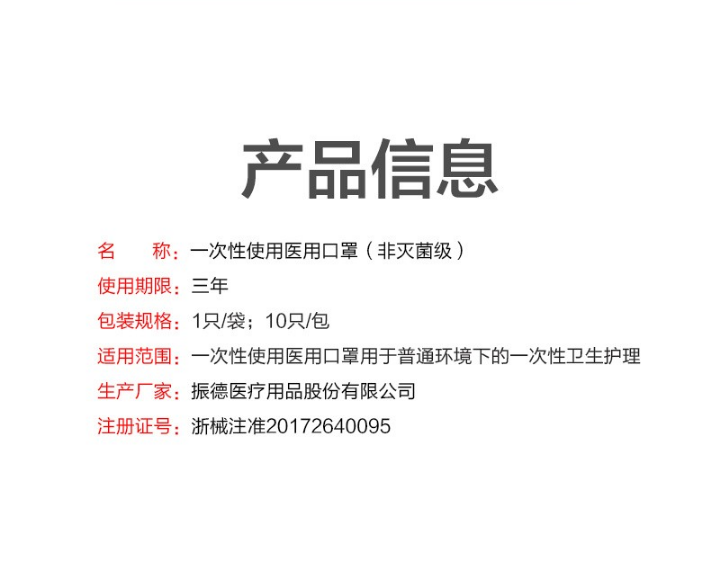 商品名称:振德医疗一次性使用医用口罩纱布内层独立包装 浅蓝色(10只独立装)(纱布内层) 商品毛重:100.00g 商品产地:中国大陆 口罩佩戴方式:耳戴式 类别:一次性医用 口罩类型:平板式 是否灭菌级:非灭菌级 国产/进口:国产