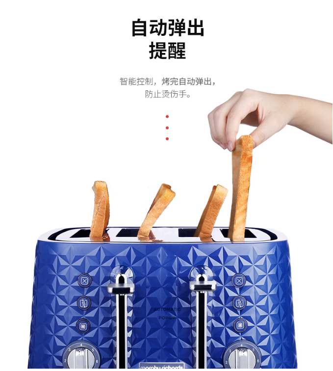 商品名称:摩飞电器MR8105 商品毛重:3.3kg 商品产地:中国大陆 特色功能:双管烘烤 容量:500g以下 加热方式:电热管 类型:多士炉搅拌叶片 种类:无搅拌叶片 液晶显示:无液晶显示 操控方式:按键式