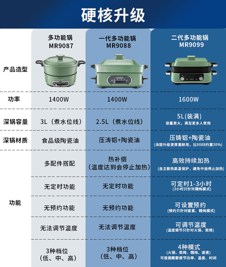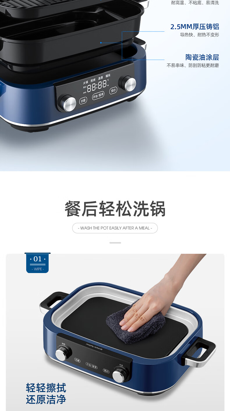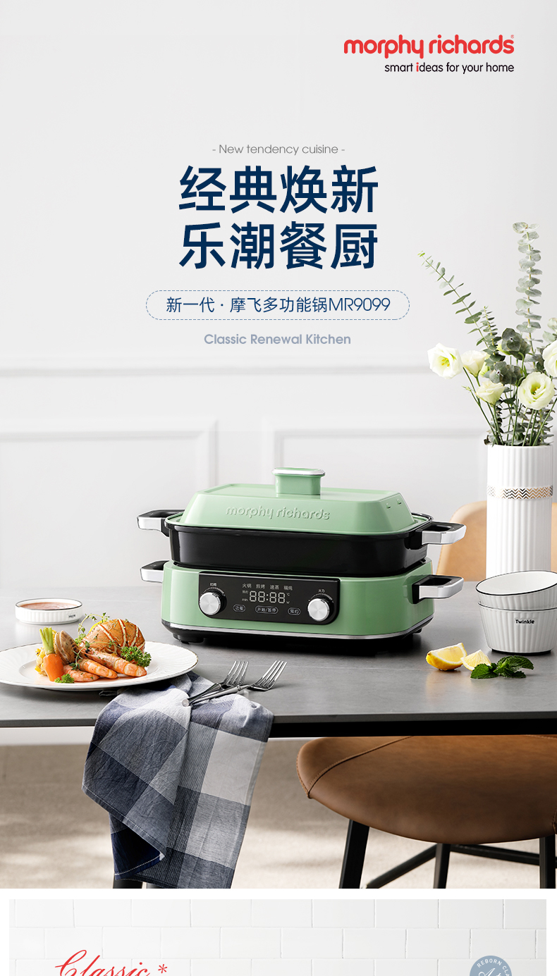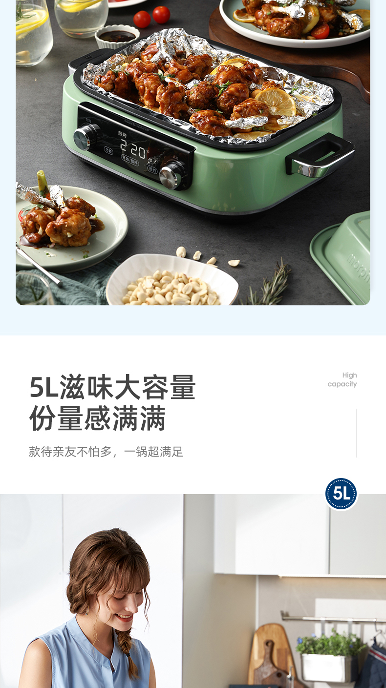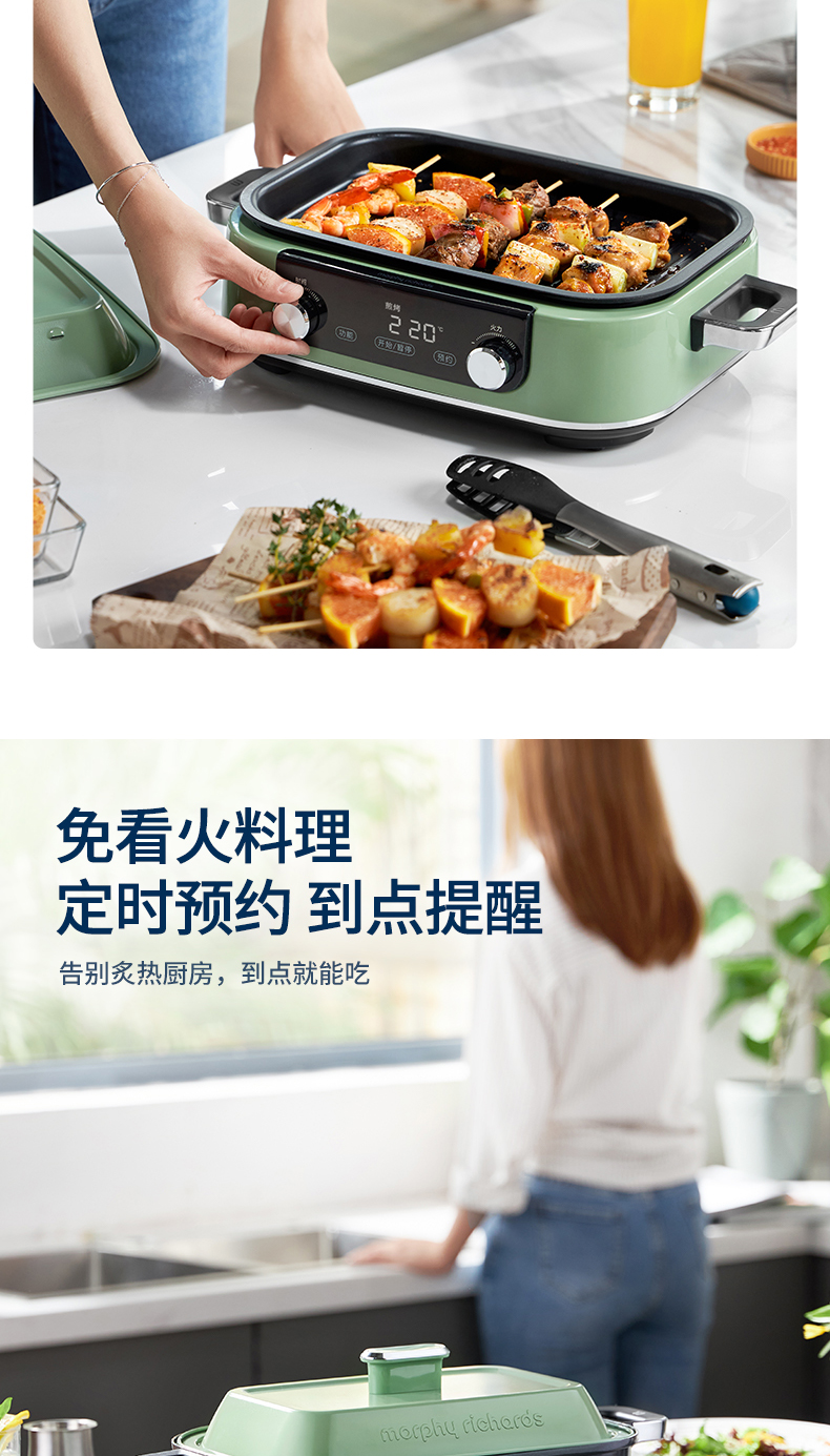 摩飞多功能锅二代分体电火锅魔飞家用烤肉涮煎蒸煮电热锅大容量升级触屏预约调时料理锅MR9099 清新绿 自营