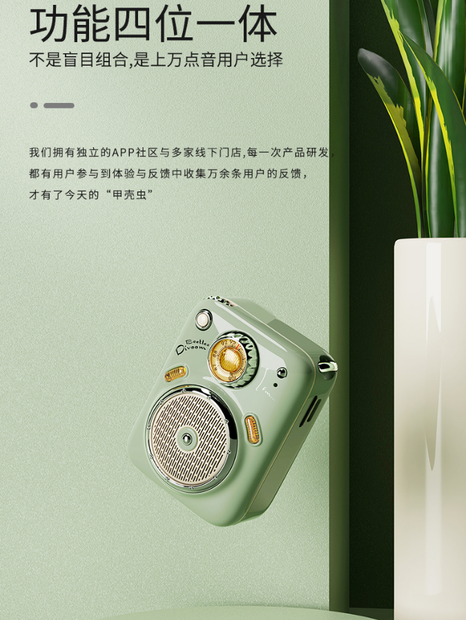 商品名称:Divoom甲壳虫 商品毛重:340.00g 商品产地:中国大陆 附加功能:收音机 类别:品质音箱 适用场景:户外