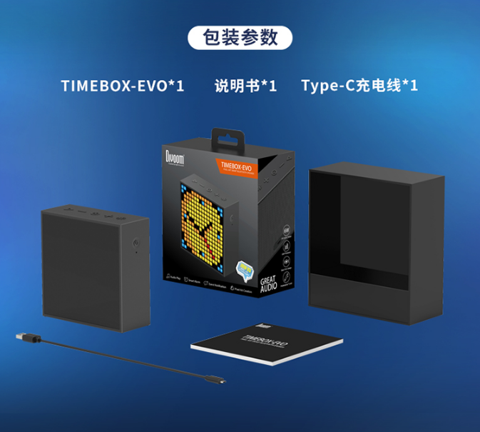 商品名称:DivoomTimebox-evo 商品毛重:0.62kg 商品产地:中国大陆 货号:Timebox-evo 附加功能:APP操控 类别:品质音箱 适用场景:家用