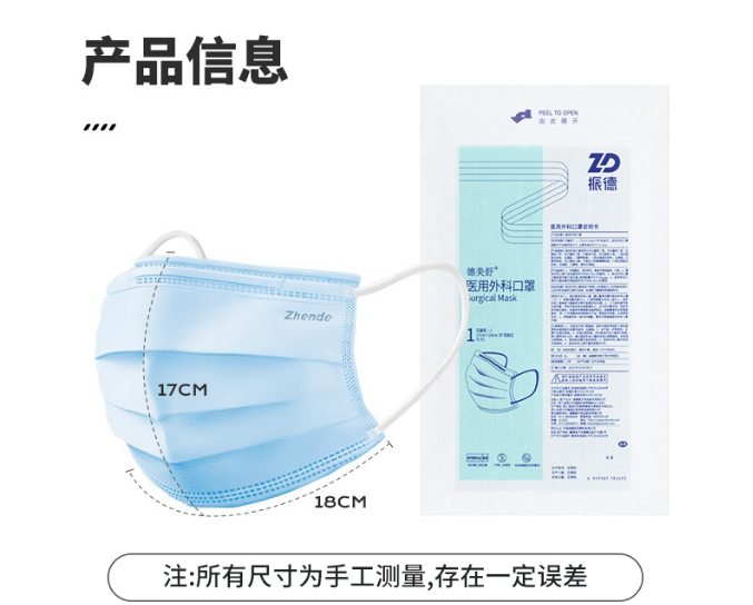 商品名称:振德外科口罩 50只/盒 商品毛重:400.00g 商品产地:中国大陆 货号:M742317180111K-13口罩 佩戴方式:耳戴式 类别:医用外科 口罩特点:防花粉/粉尘 类型:折叠式 是否灭菌级:灭菌级 国产/进口:国产