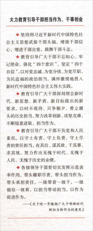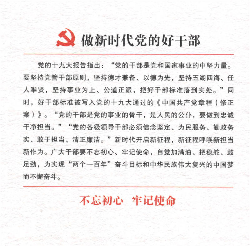 党的十九大报告指出:“党的干部是党和国家事业的中坚力量。要坚持党管干部原则,坚持德才兼备、以德为先,坚持五湖四海、任人唯贤,坚持事业为上、公道正派,把好干部标准落到实处。”同时,好干部标准被写入党的十九大通过的《中国共产党章程(修正案)》。“党的干部是党的事业的骨干,是人民的公仆,要做到忠诚干净担当。”“党的各级领导干部必须信念坚定、为民服务、勤政务实、敢于担当、清正廉洁。”新时代开启新征程,新征程呼唤新担当新作为。广大干部要不忘初心、牢记使命,自觉加满油、把稳舵、鼓足劲,为实现“两个一百年”奋斗目标和中华民族伟大复兴的中国梦而不懈奋斗。