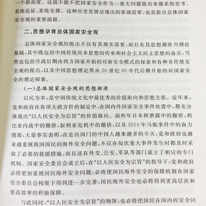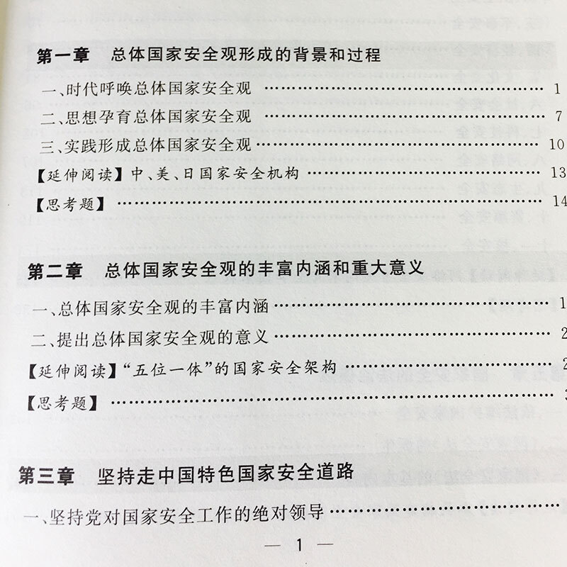 《总体国家安全观教育读本》共分六章。第一章总体国家安全观形成的背景和过程。本章从历史背景和理论梳理的角度,阐释了总体国家安全观。第二章总体国家安全观的丰富内涵和重大意义。本章从不同角度阐释了总体国家安全观的科学内涵以及战略意义。第三章坚持中国特色的安全道路。本章从党的领导、国家利益、人民安全、共同安全、民族复兴五个方面阐述了中国特色安全道路。第四章维护重点领域的国家安全。本章从政治安全、国土安全、军事安全、经济安全、文化安全、社会安全、科技安全、信息安全、生态安全、资源安全、核安全等11个方面阐述了国家安全的具体领域。第五章国家安全的法治保障。本章从《国家安全法》的制定以及主要内容阐述总体国家安全观。第六章总体国家安全观的实践要求。本章从机关、干部和公民三个角度来阐述如何落实总体国家安全观。