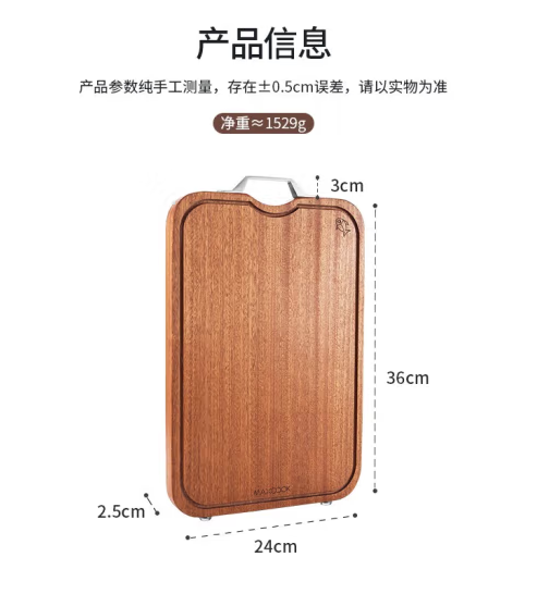商品名称:美厨乌檀木砧板菜板商品毛重:1.94kg商品产地:中国大陆材质:木制是否拼接:非拼接包装形式:独立装是否带架:无砧板架是否抗菌:非抗菌是否双面材质:单材质用途:切菜板形状:长方形国产/进口:国产