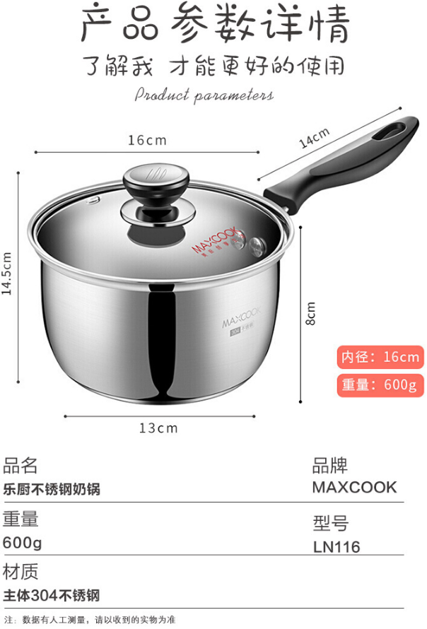 美厨(maxcook)奶锅 304不锈钢奶锅汤锅16cm 泡面煮奶辅食锅 加厚复合底 燃气炉电磁炉通用LN116 自营