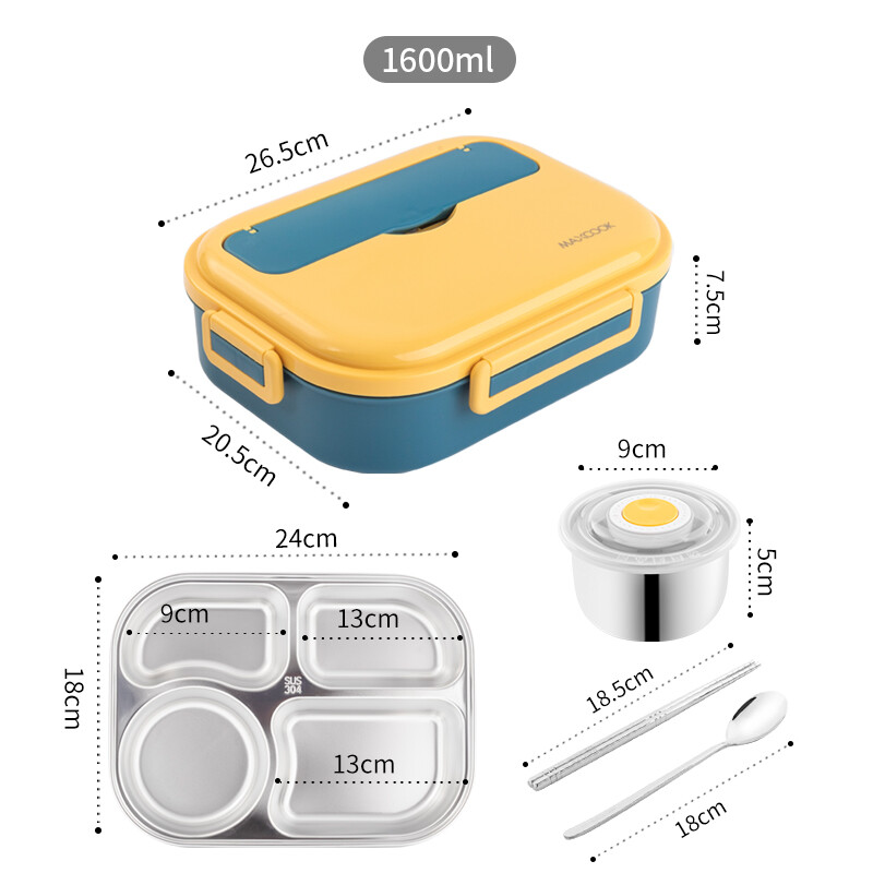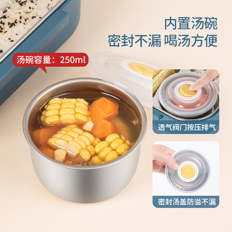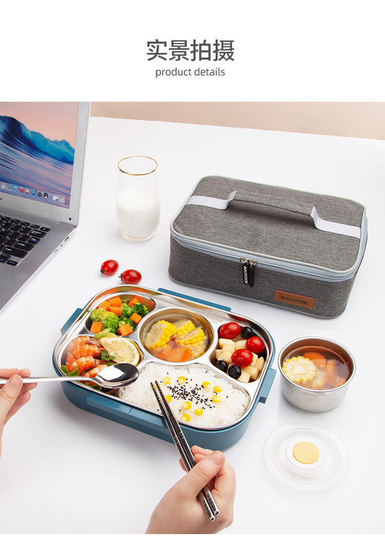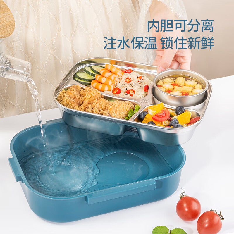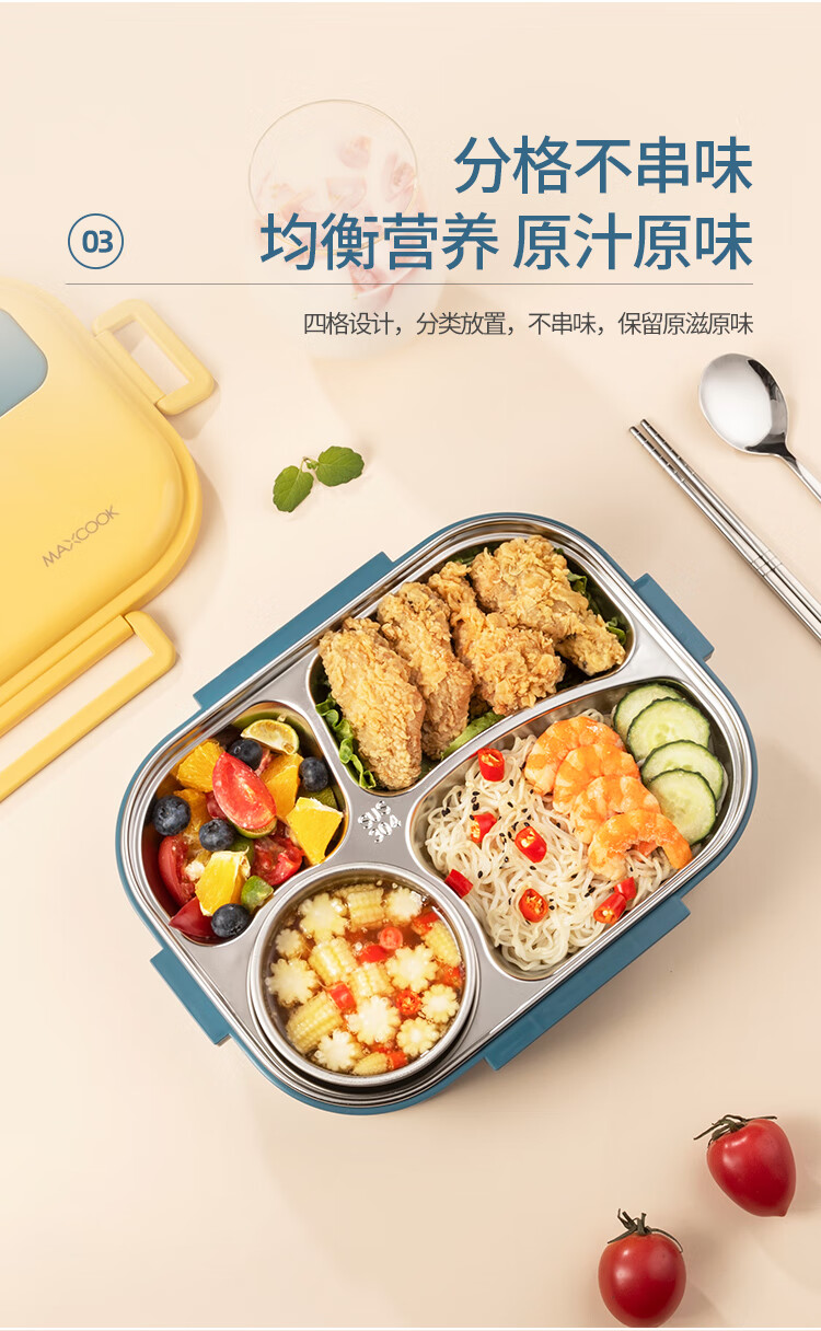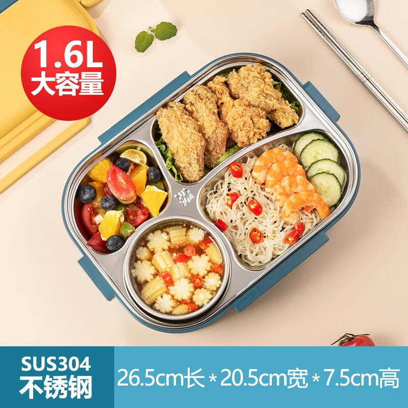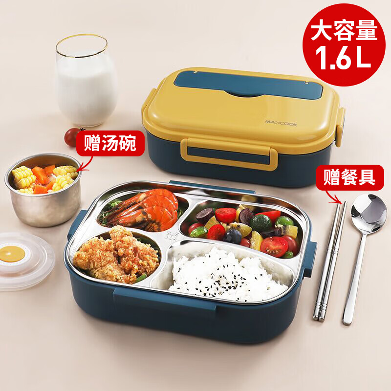 美厨(MAXCOOK)304不锈钢饭盒 4.5cm加大加深学生分格餐盒分隔饭盒男女保温便当盒配密封盖 深邃蓝四格1.6L【配筷勺+汤碗】MCFT532 自营