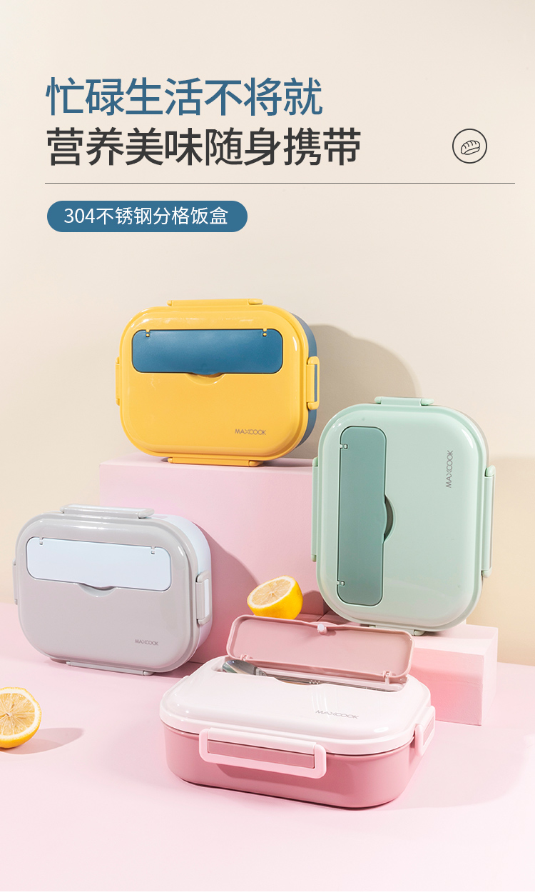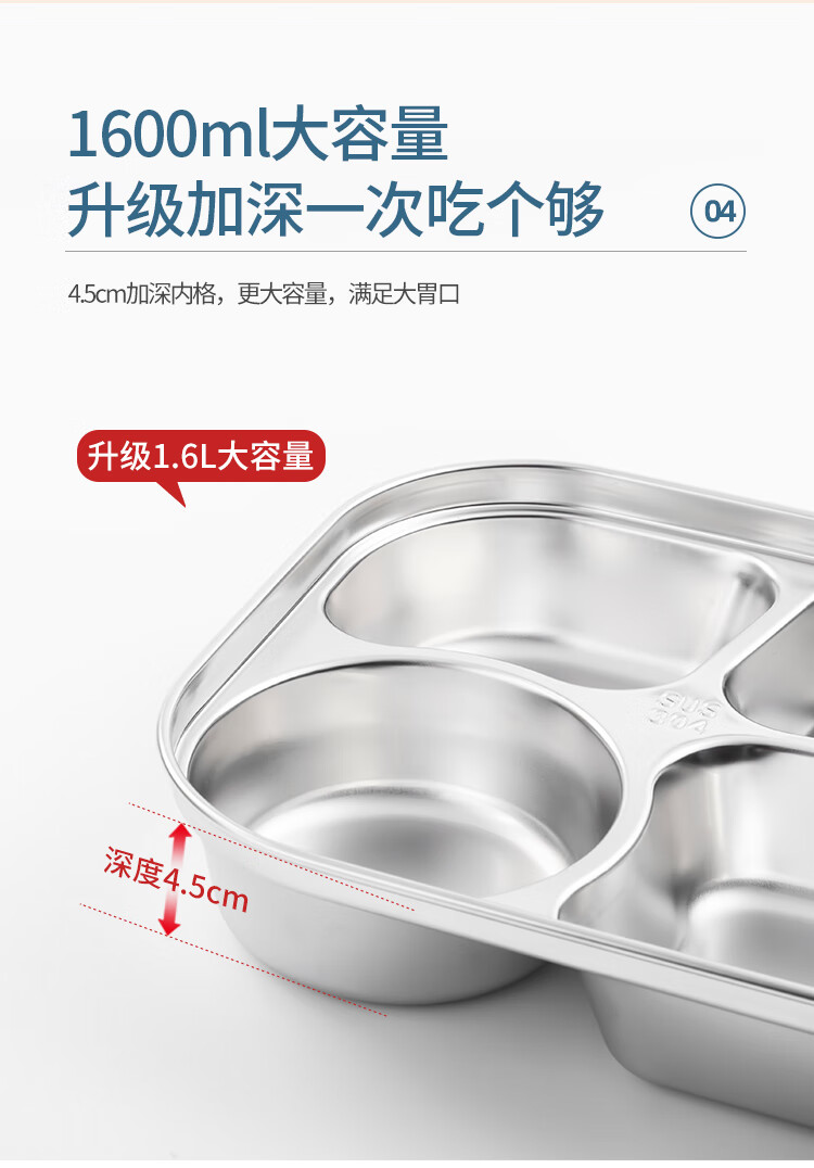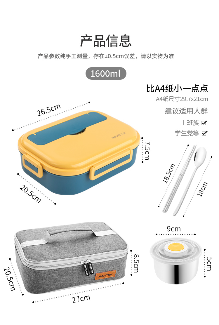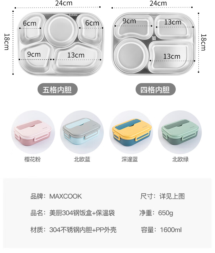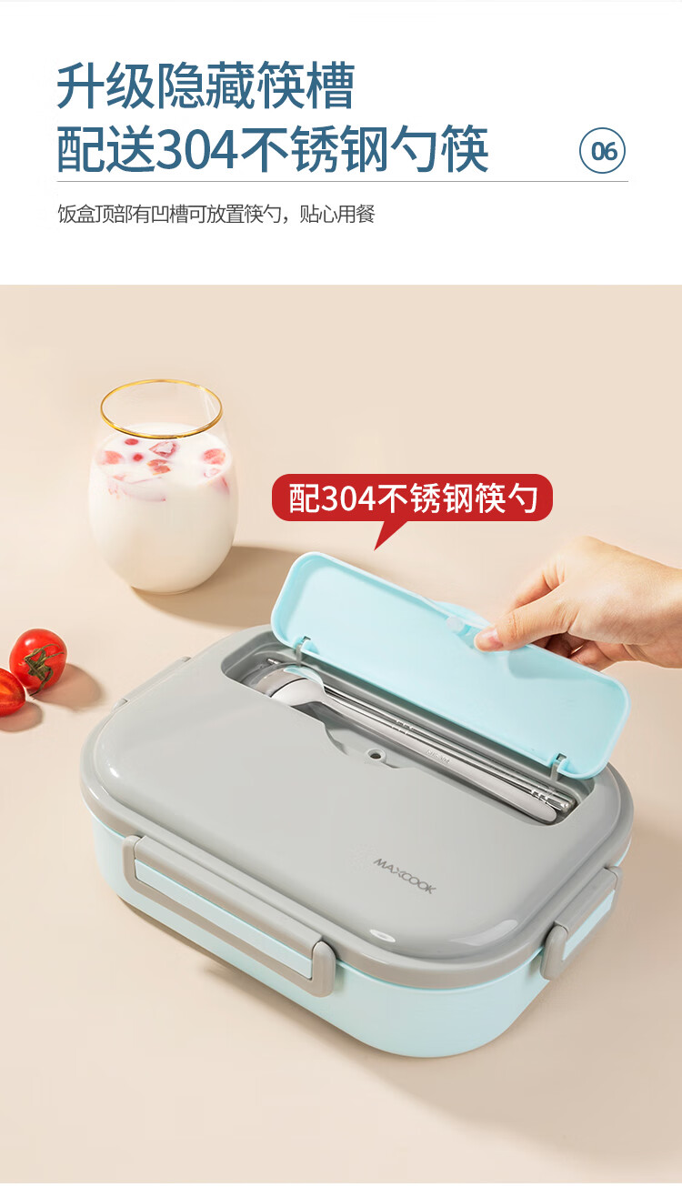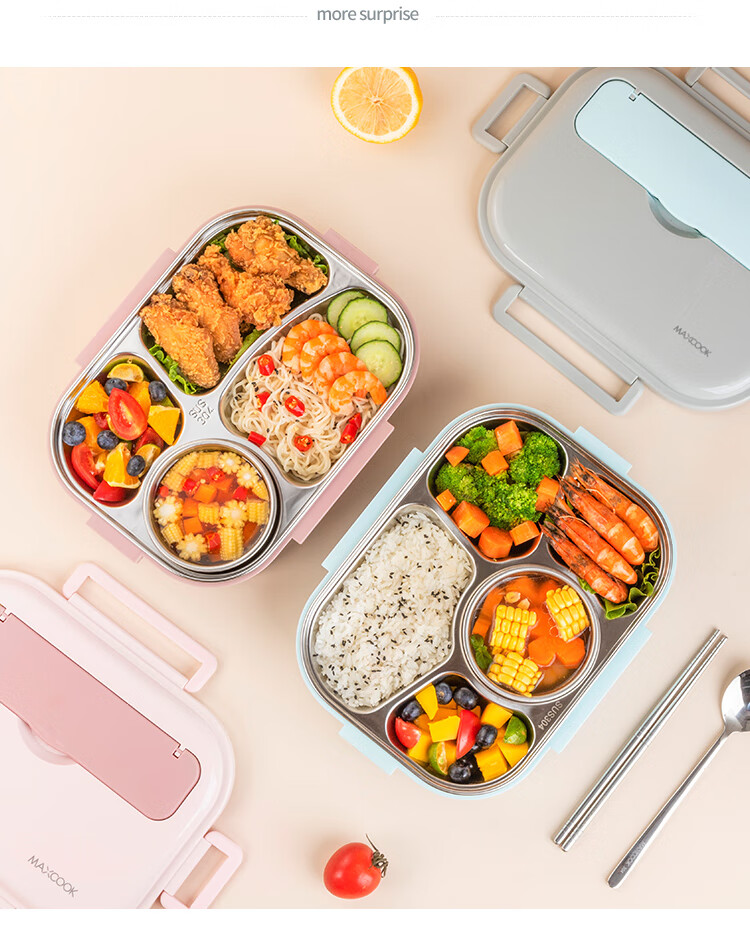 美厨(MAXCOOK)304不锈钢饭盒 4.5cm加大加深学生分格餐盒分隔饭盒男女保温便当盒配密封盖 深邃蓝四格1.6L【配筷勺+汤碗】MCFT532 自营