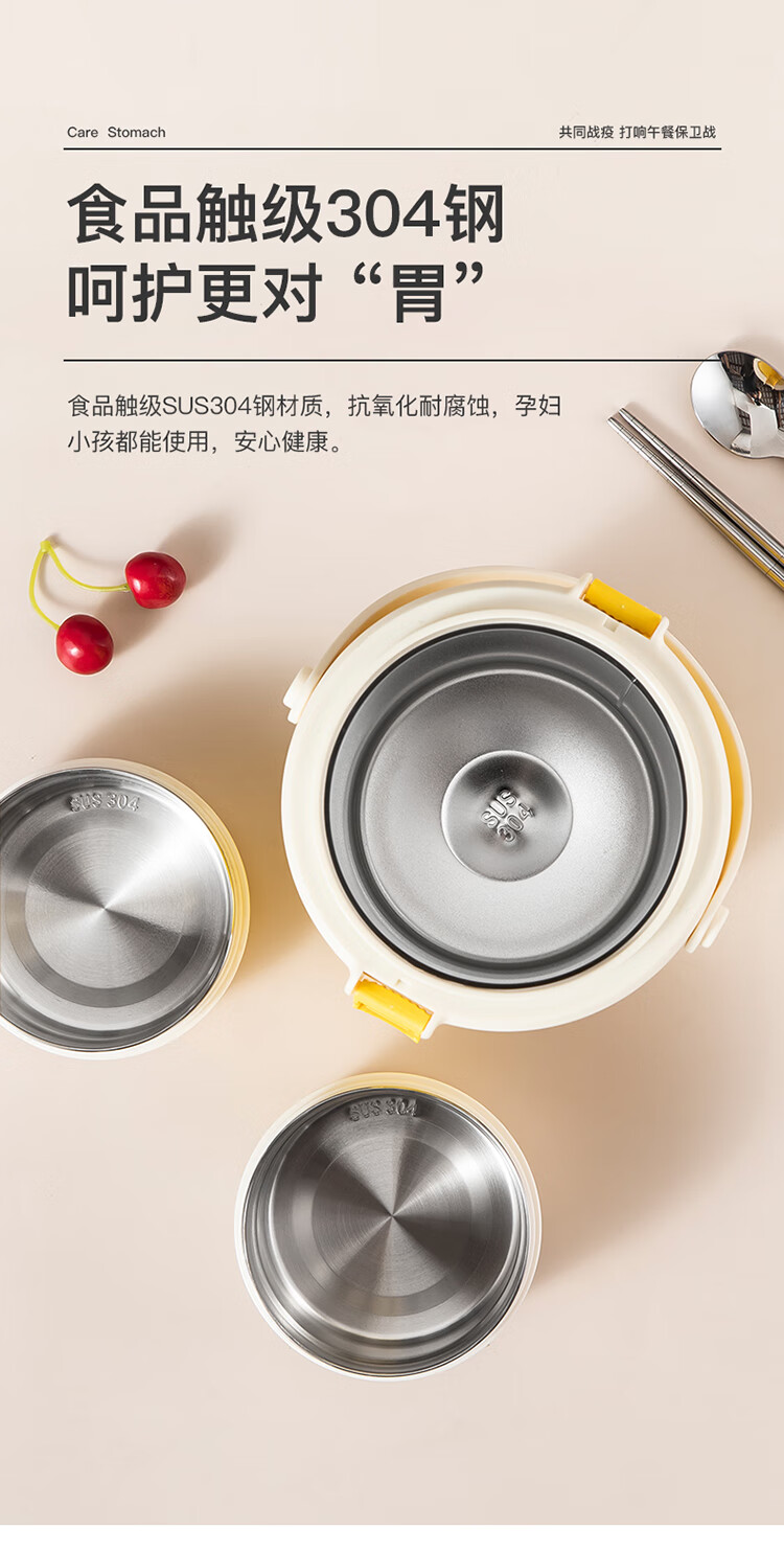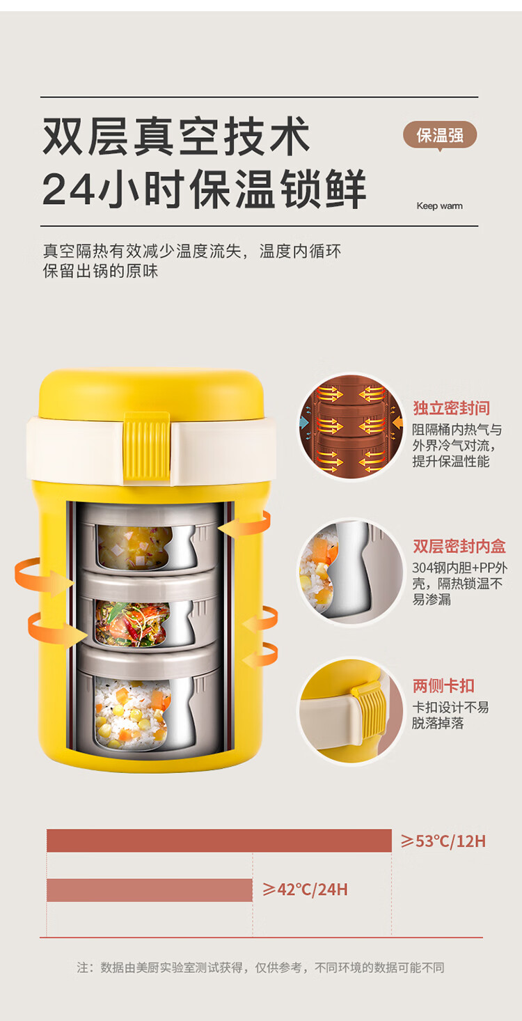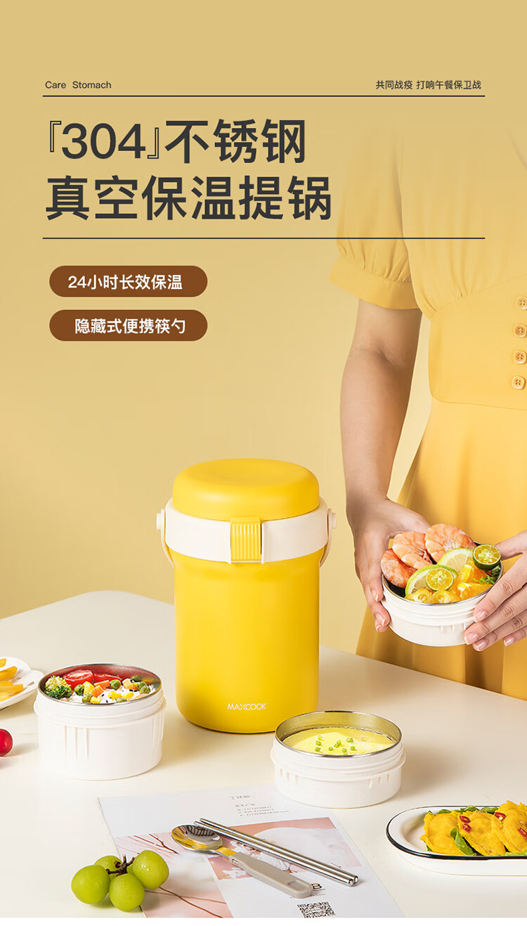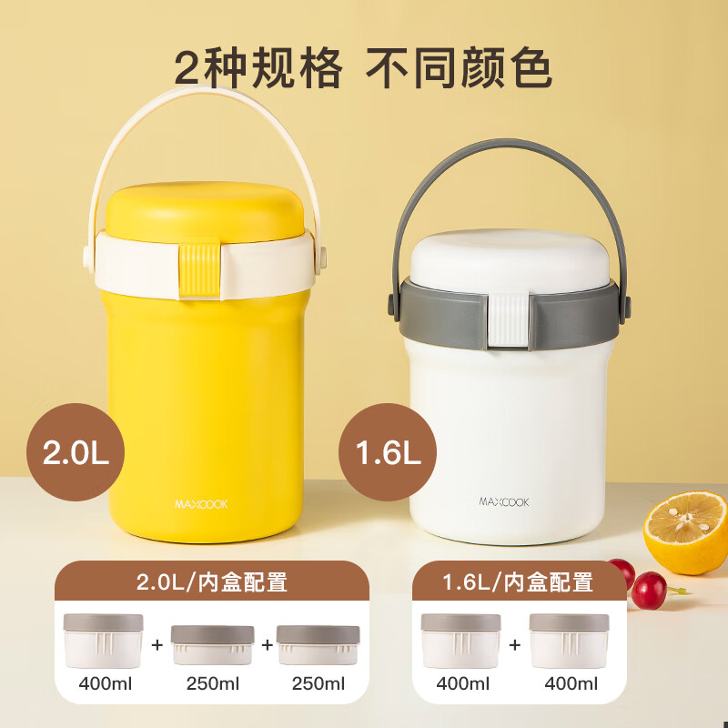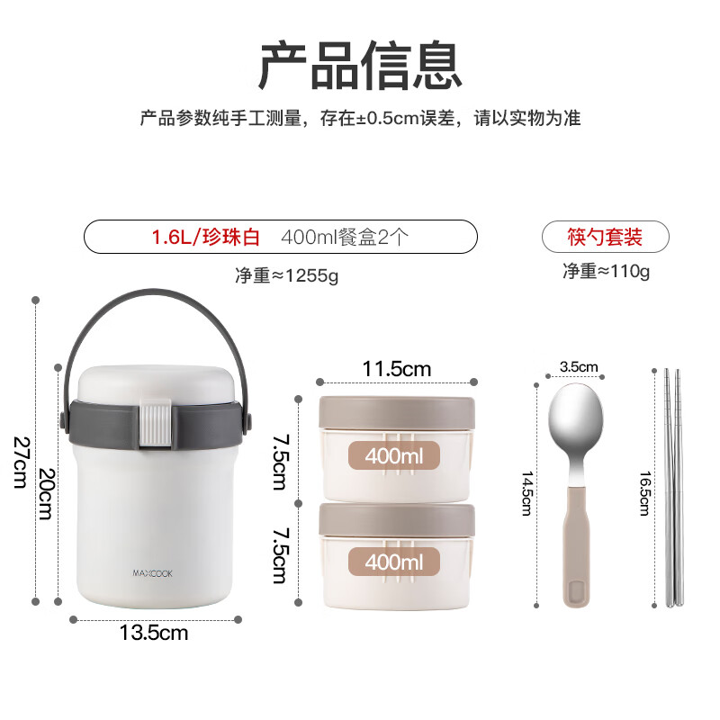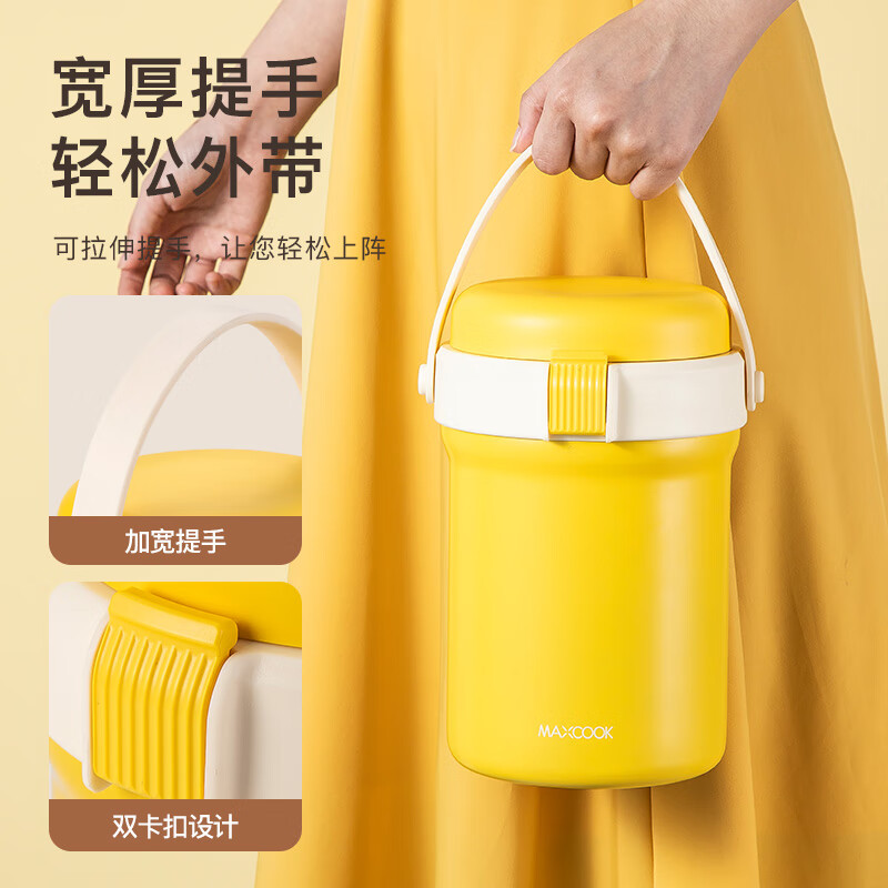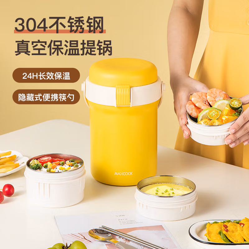 美厨(MAXCOOK)保温饭盒提锅 304不锈钢真空保温桶 多层分格成人学生便当盒保温汤桶餐盒 【珍珠白1.6L】配餐具 MCTG0942 自营