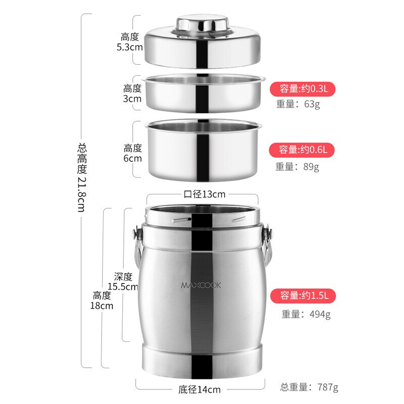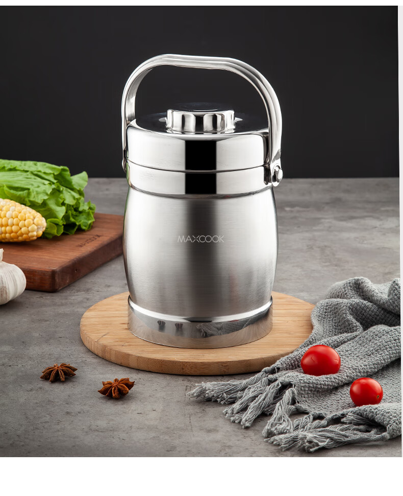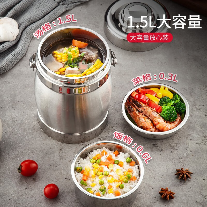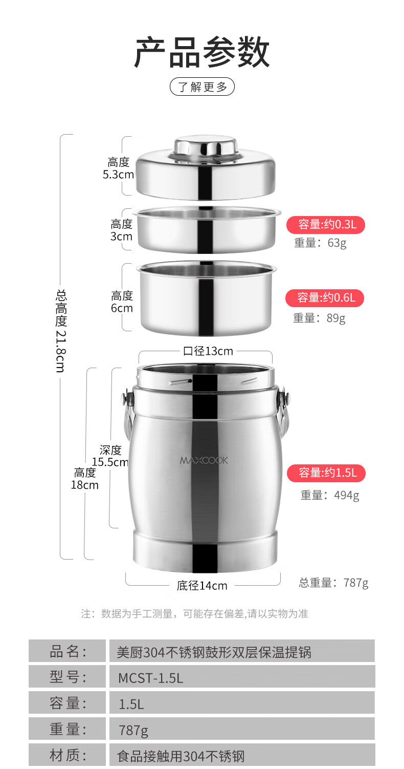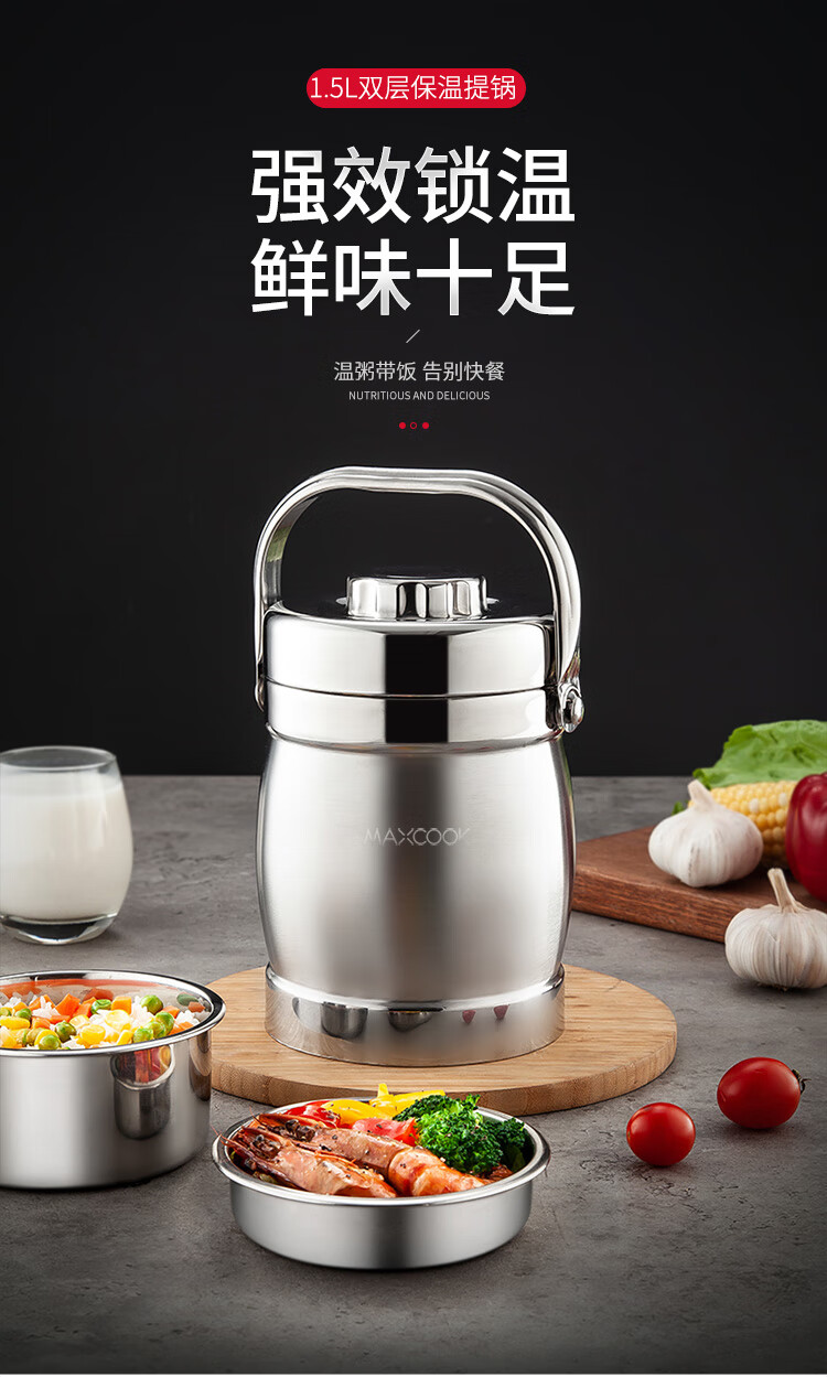 美厨(maxcook)304不锈钢保温提锅饭盒 1.5L 双层鼓形 MCST-1.5 自营