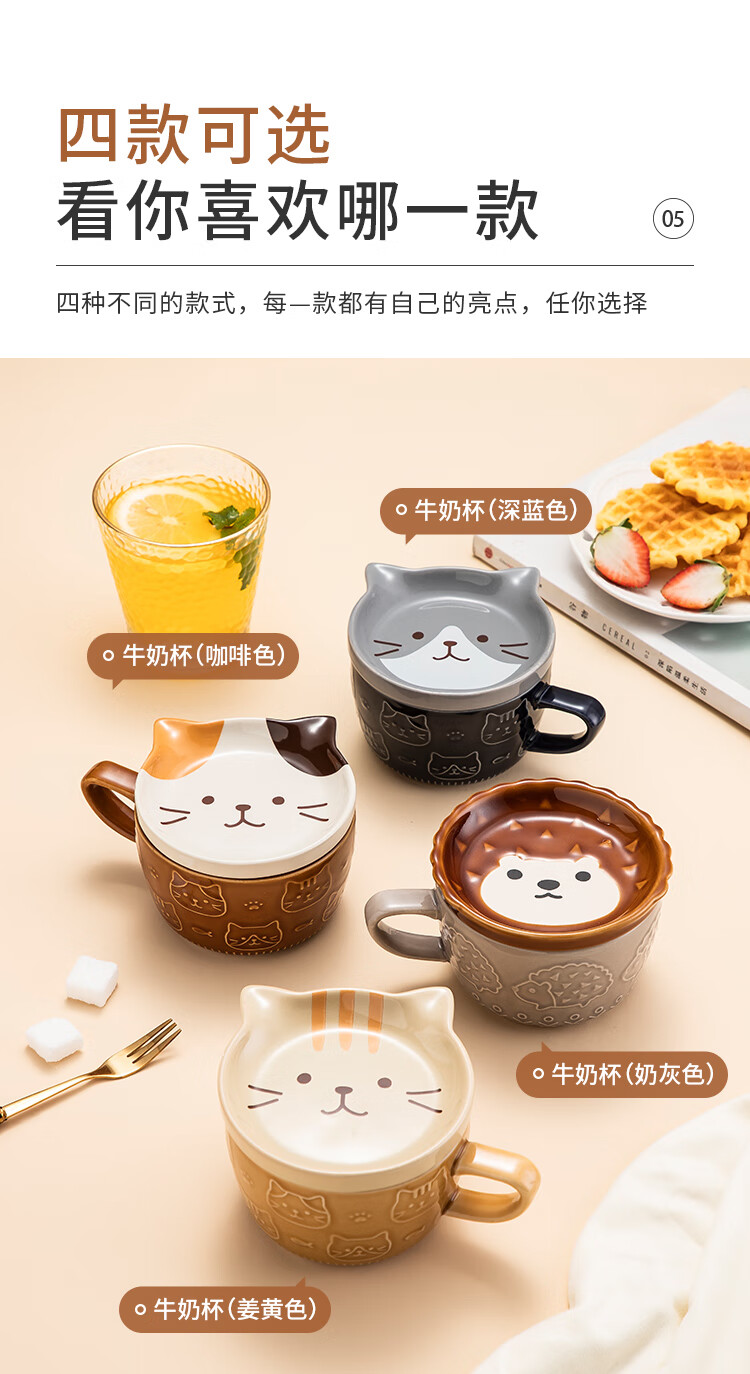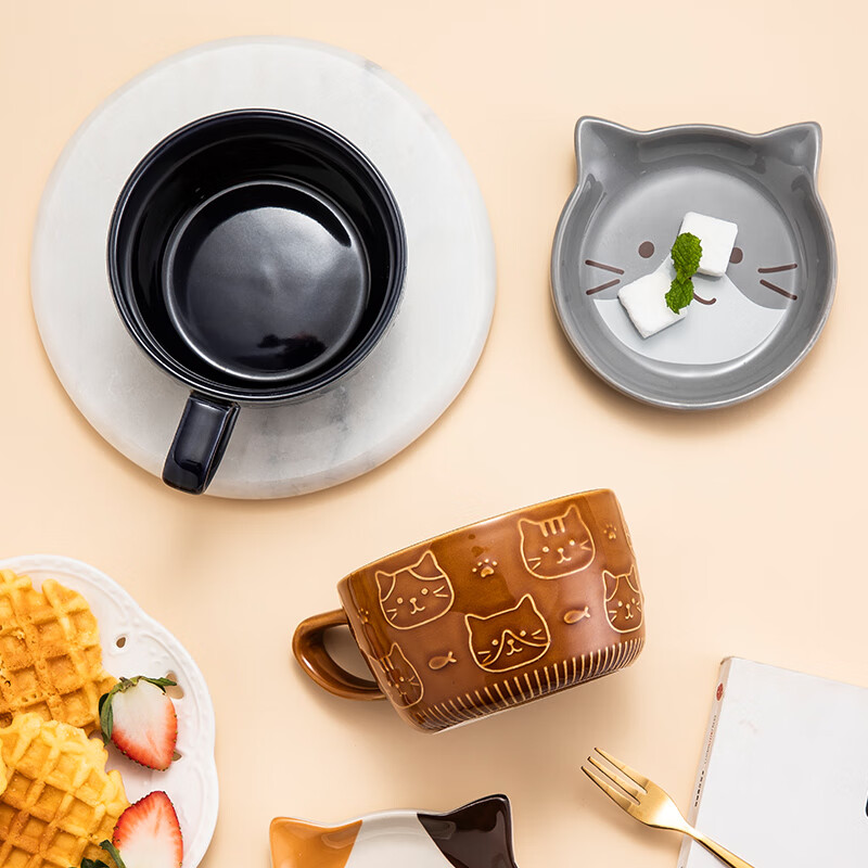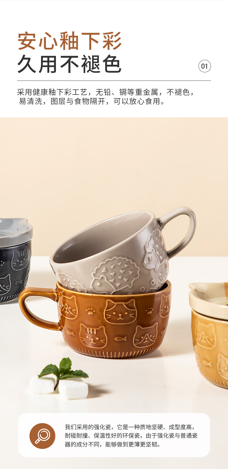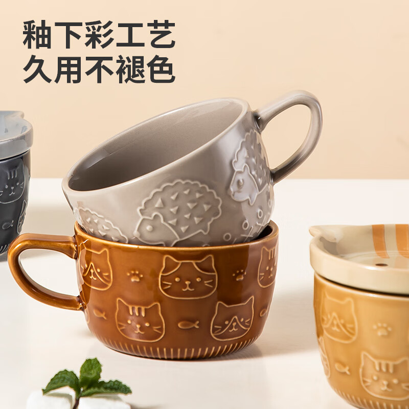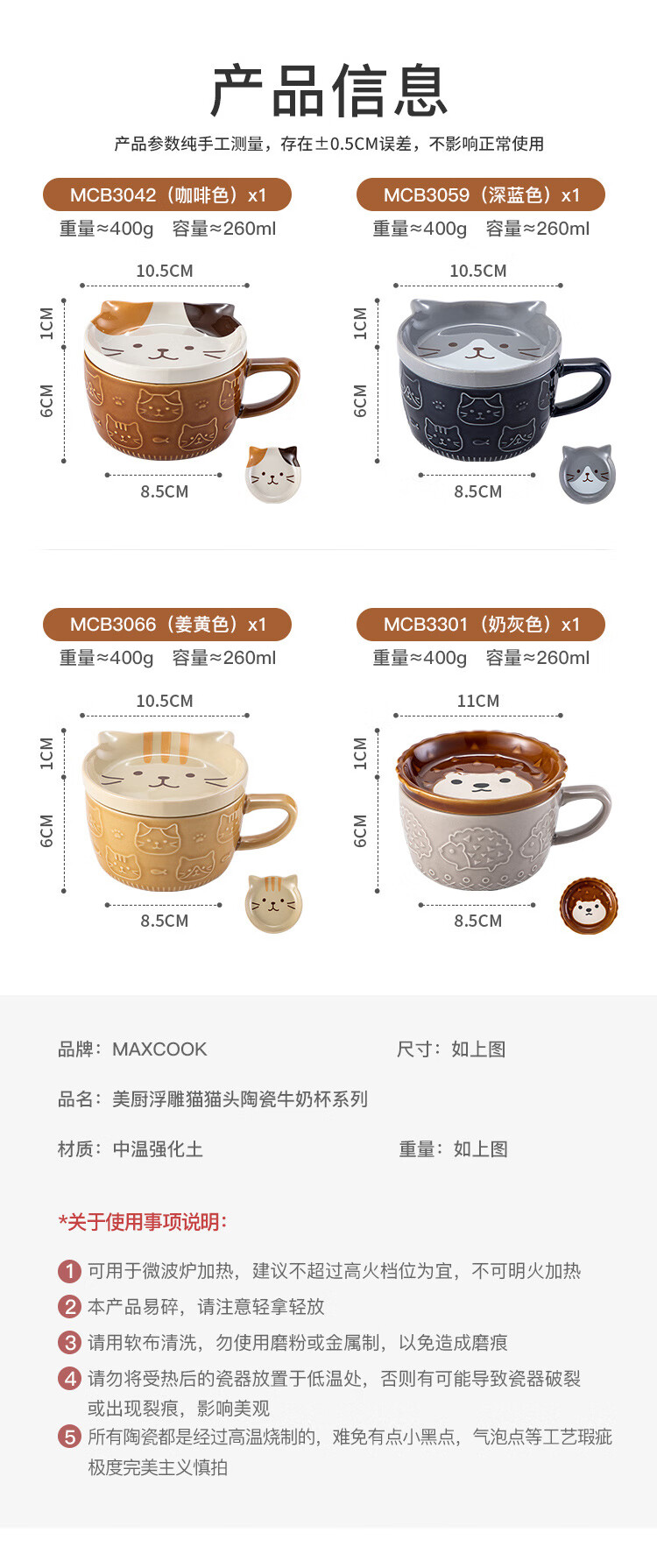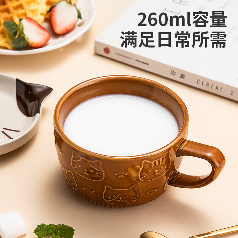 美厨(maxcook)陶瓷杯马克杯 水杯泡茶杯 咖啡杯早餐杯牛奶杯 浮雕猫猫头 姜黄色MCB3066 自营