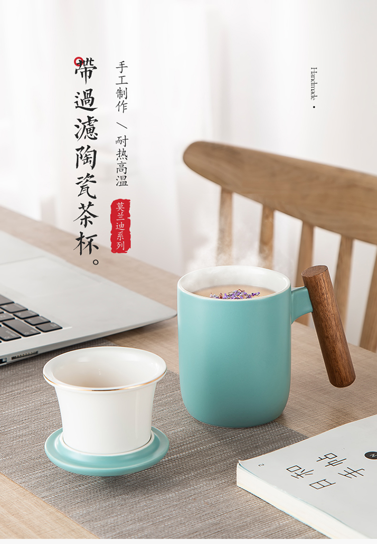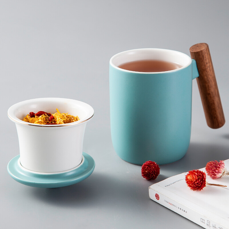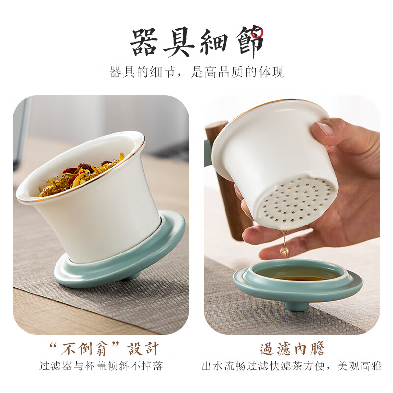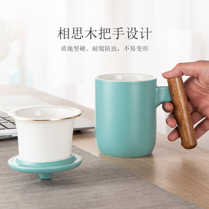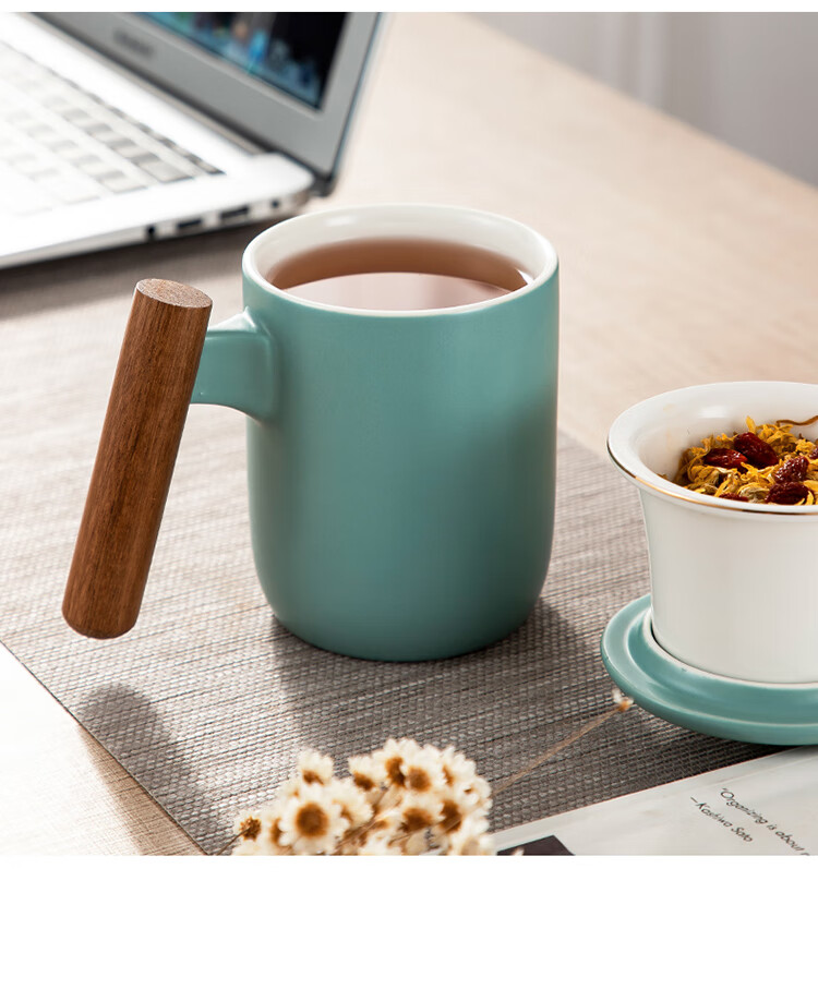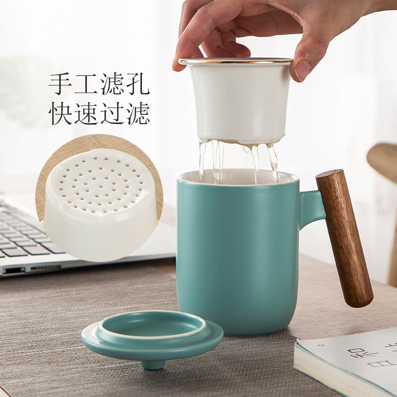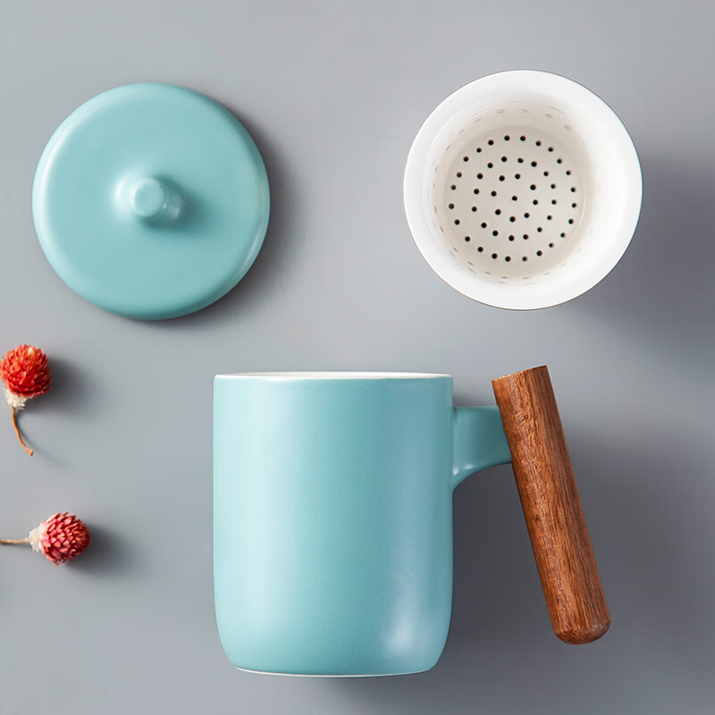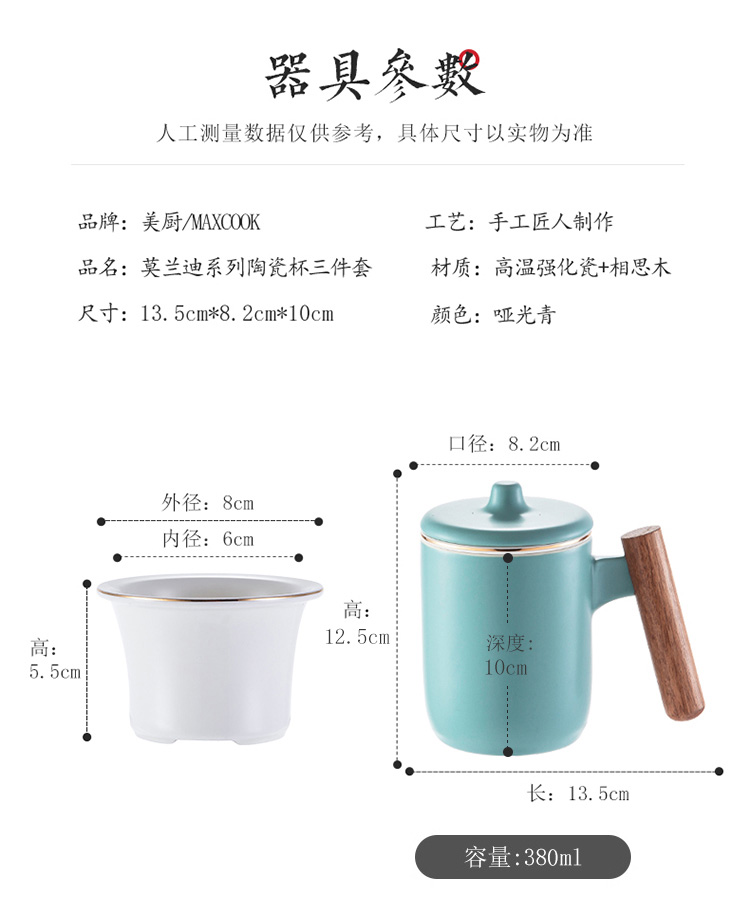 美厨(maxcook)带茶漏茶杯 陶瓷三件杯 马克杯水杯泡茶杯 咖啡杯早餐杯带滤隔 380ml哑光青MCTC124 自营