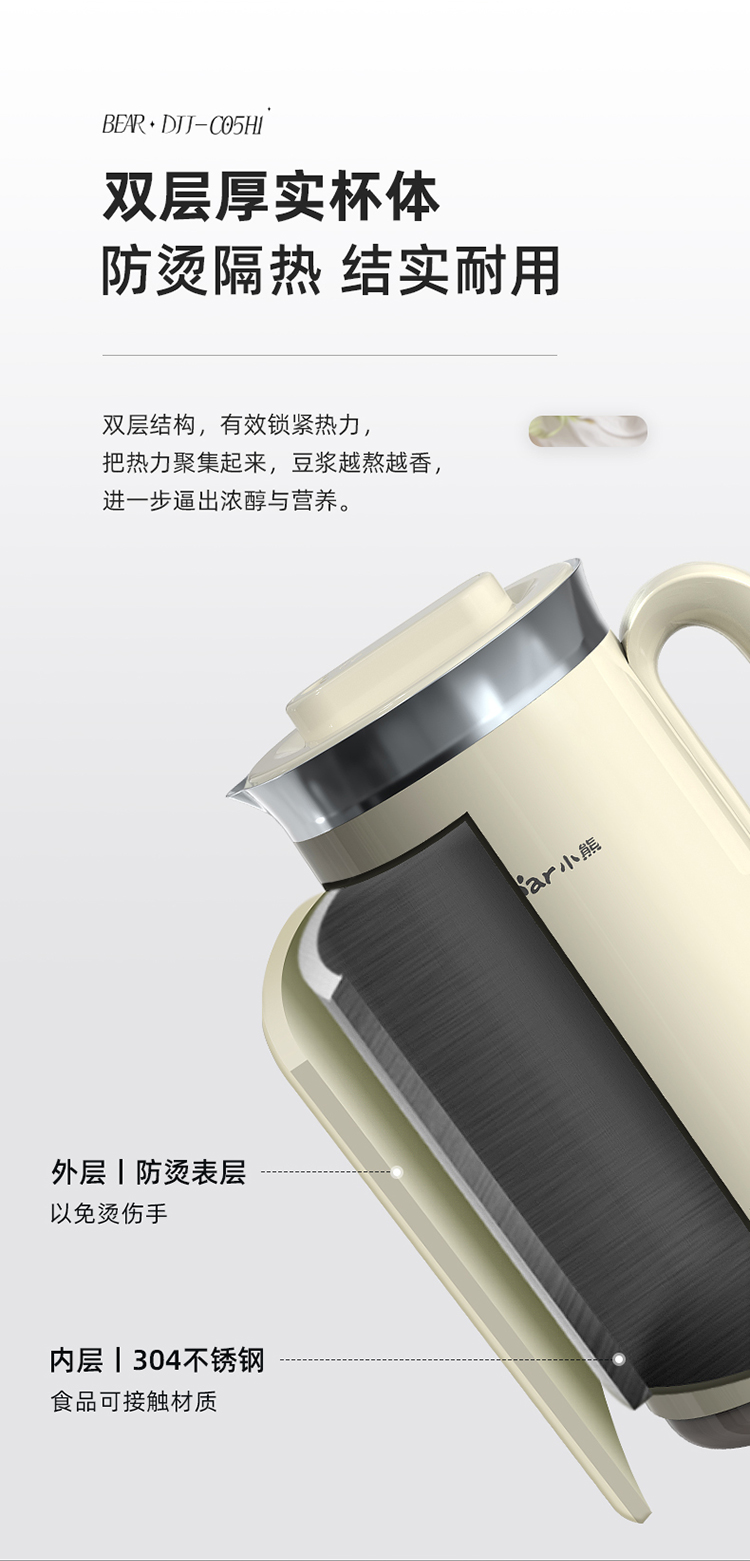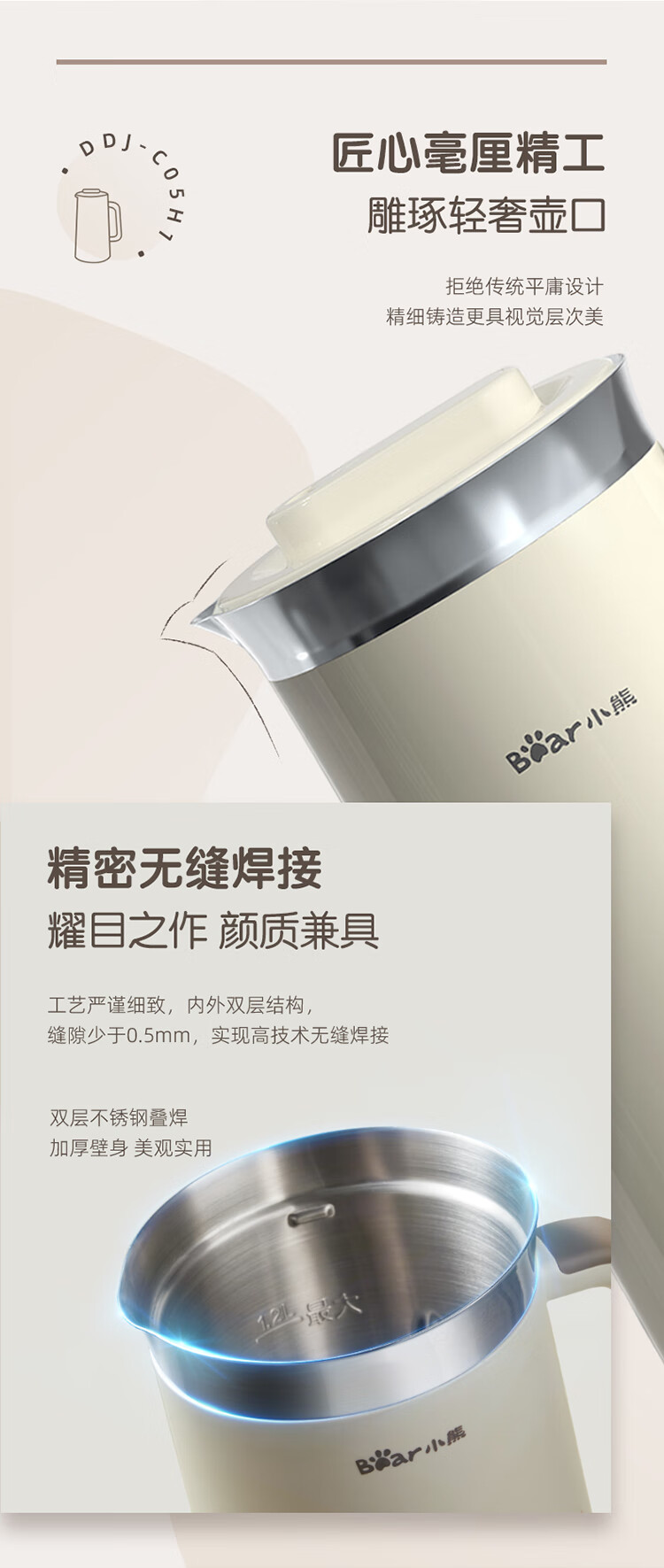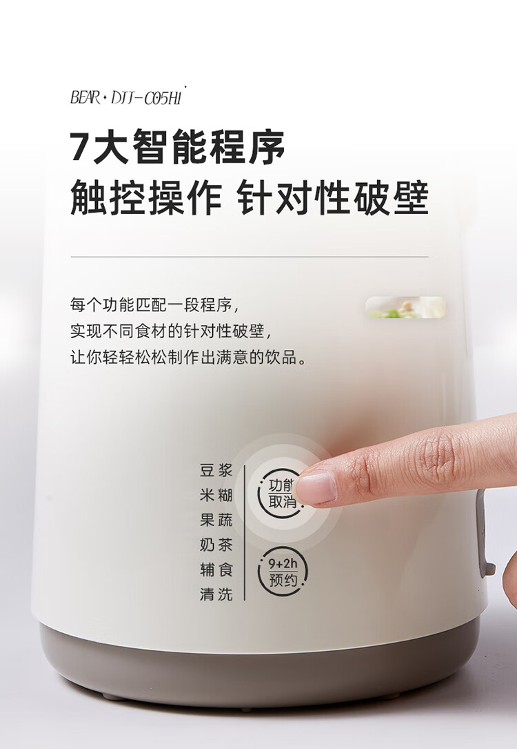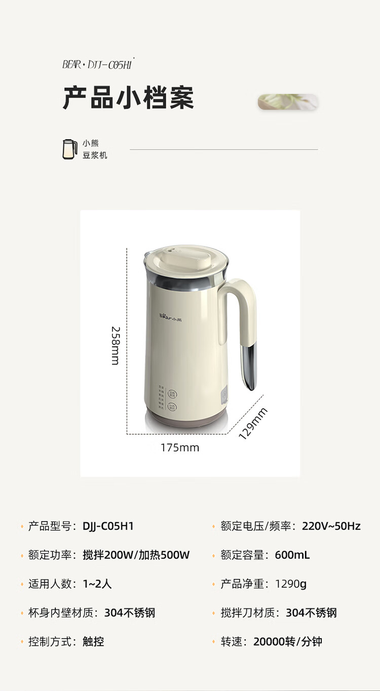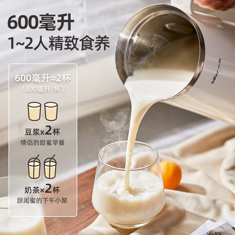 小熊(Bear)豆浆机 迷你破壁机 家用小型米糊机 多功能全自动清洗免过滤 1-2人食 DJJ-C05H1 0.6L 自营