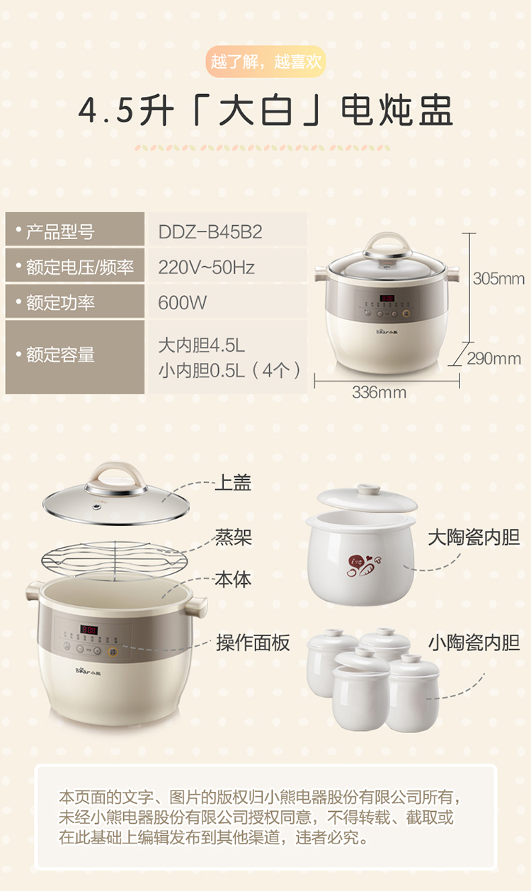 小熊(Bear)电炖锅 电炖盅 煲汤锅 炖汤锅 白瓷炖锅 家用陶瓷电砂锅隔水炖 煮粥养生锅一锅5胆 DDZ-B45B2 自营