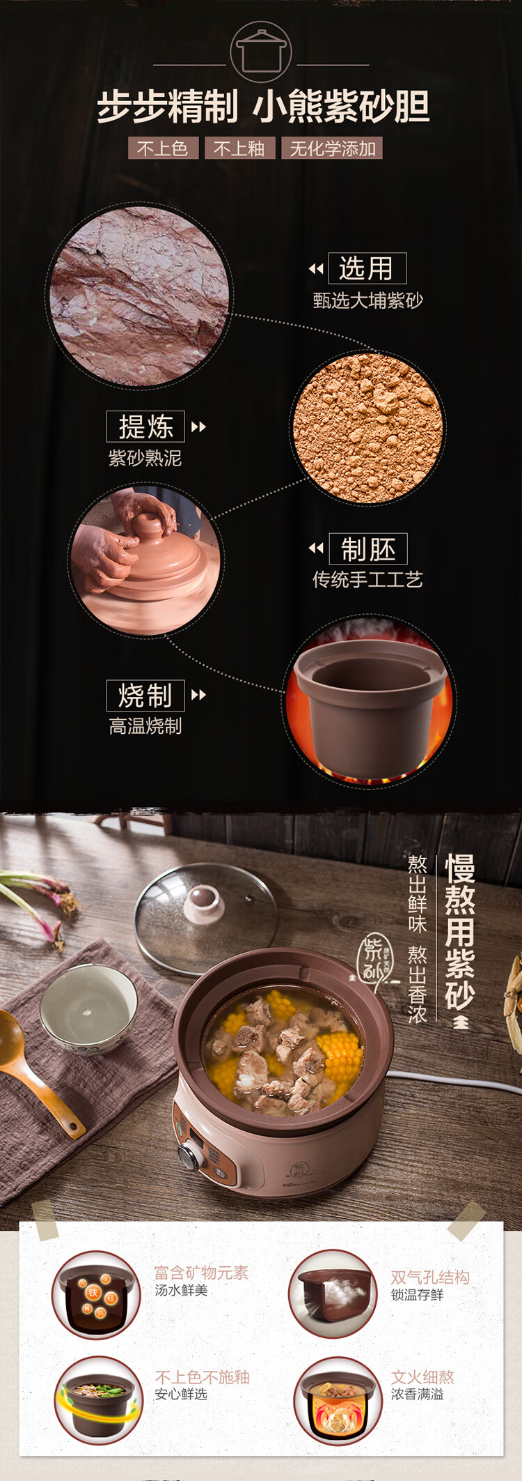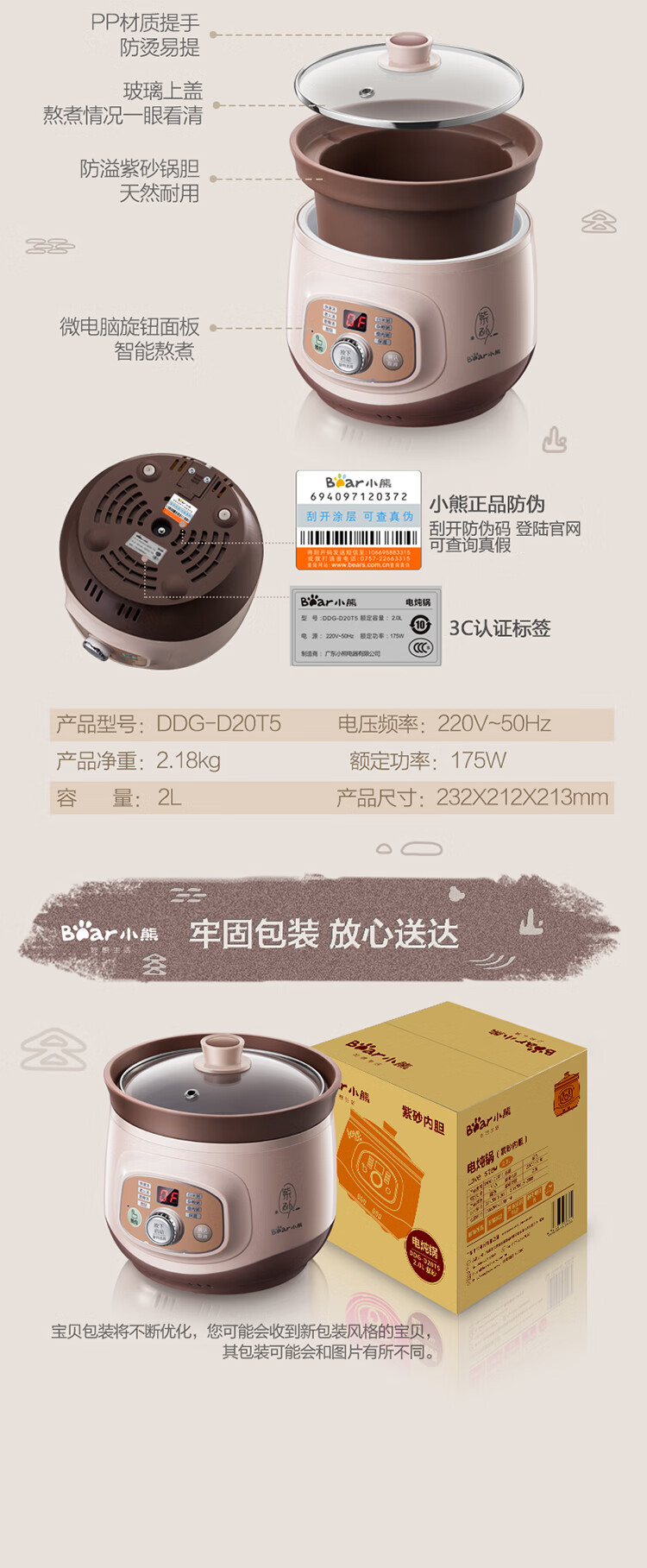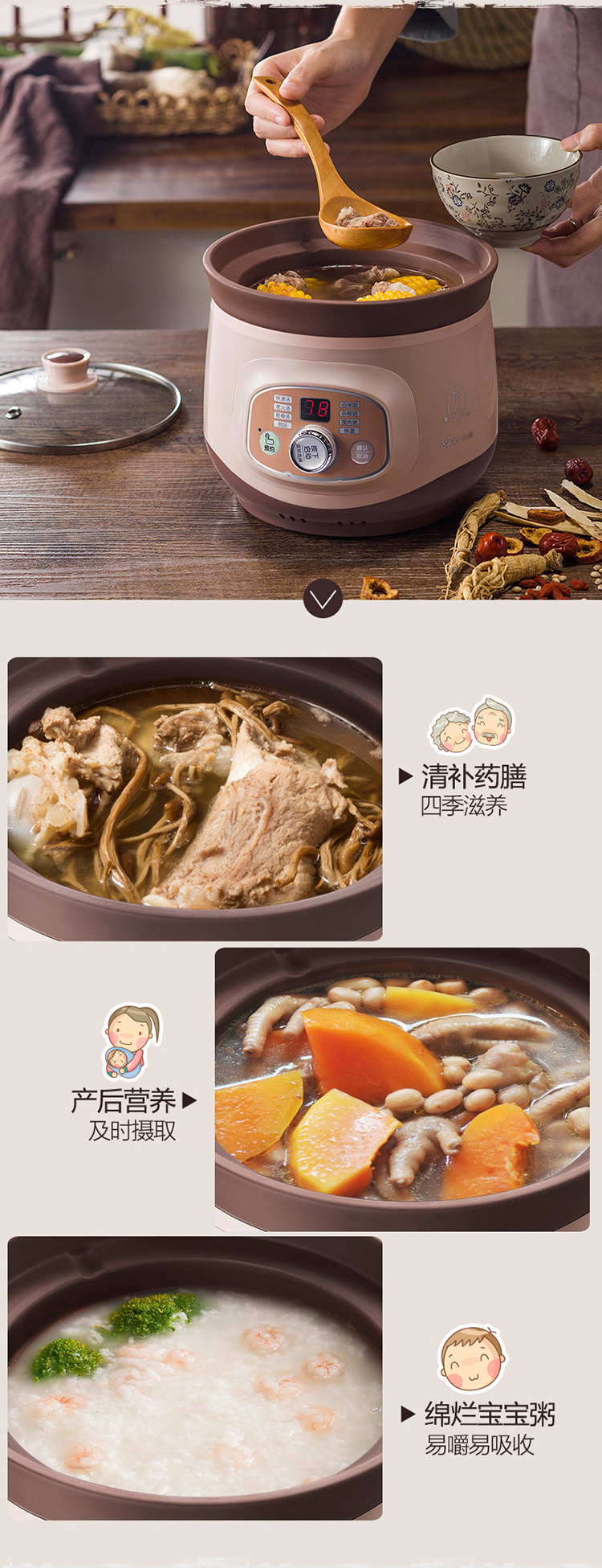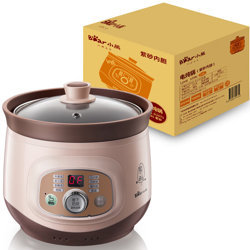 小熊(Bear)2L 电炖锅 电砂锅BB熬粥煮粥煲粥宝宝辅食煲汤锅 DDG-D20T5【ZMD安心系列】 自营