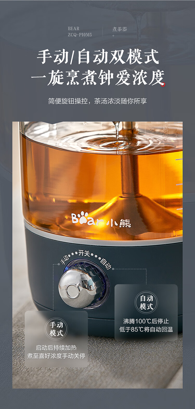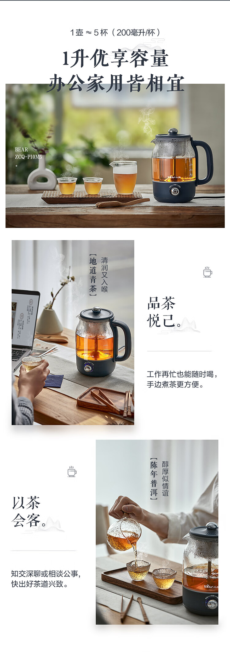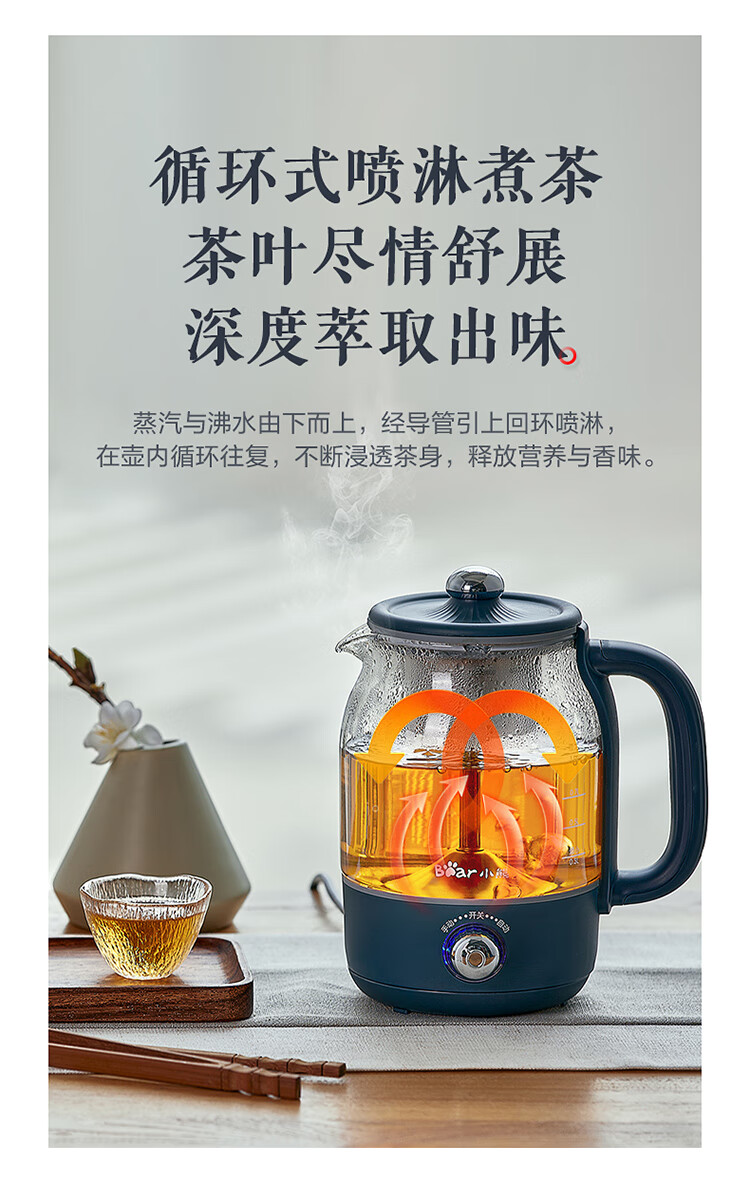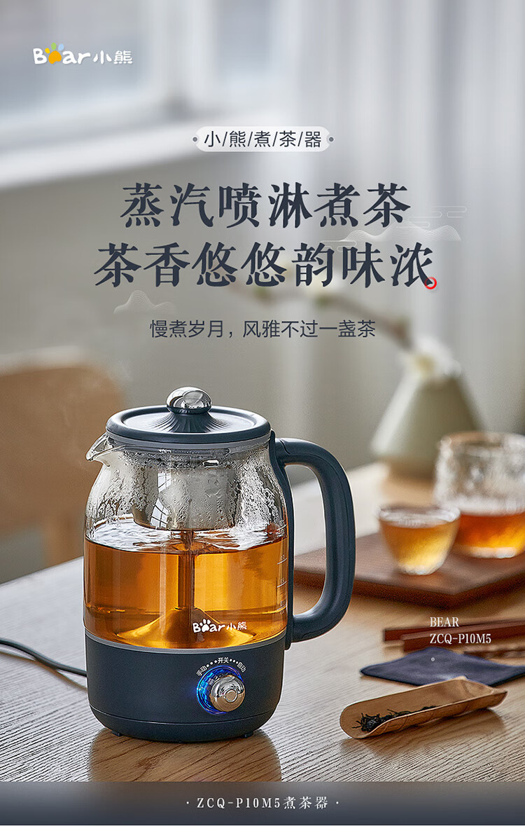 小熊(Bear)煮茶器蒸汽喷淋式 养生壶黑茶煮茶壶小型迷你1L玻璃办公室蒸茶器电泡茶炉保温电热烧水壶 ZCQ-P10M5 循环式喷淋煮茶 自营