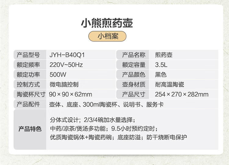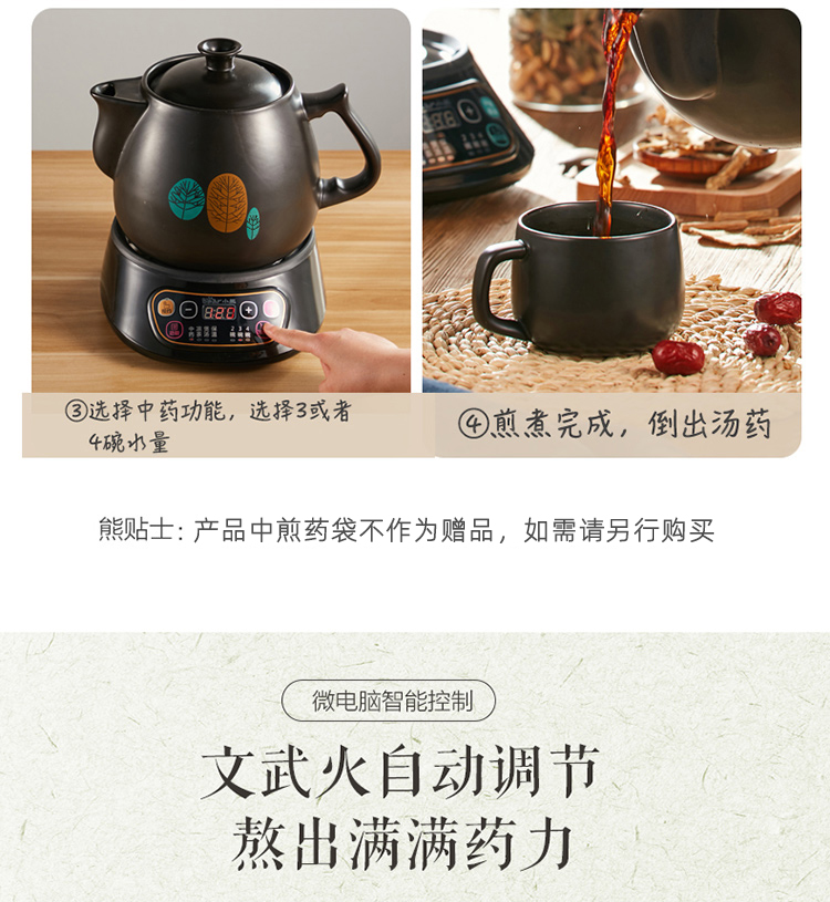小熊(Bear)中药锅煎药壶 3.5L中药壶养生壶全自动熬药砂锅药罐中药煲电药壶电药锅煲药熬药锅陶瓷JYH-B40Q1 自营