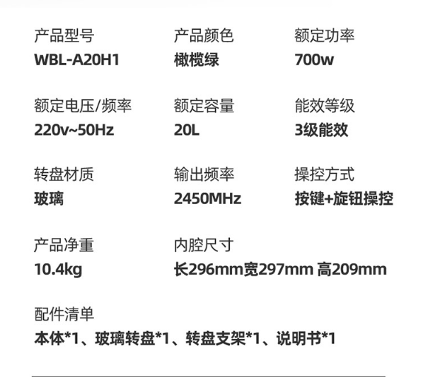 小熊(Bear)微波炉 快捷家用 智能触控 360°转盘加热 电烤箱一体机 WBL-A20H1 自营